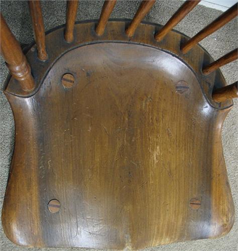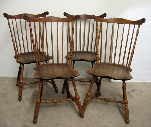Set of four Windsor mixed woods side chairs carved crest rail with fiddlehead carved ears; seven spindles flanked by baluster carved stiles; plank seats with splay legs; H-stretcher; 19th C. 38" high x 16" x 16" (no visible defects)
