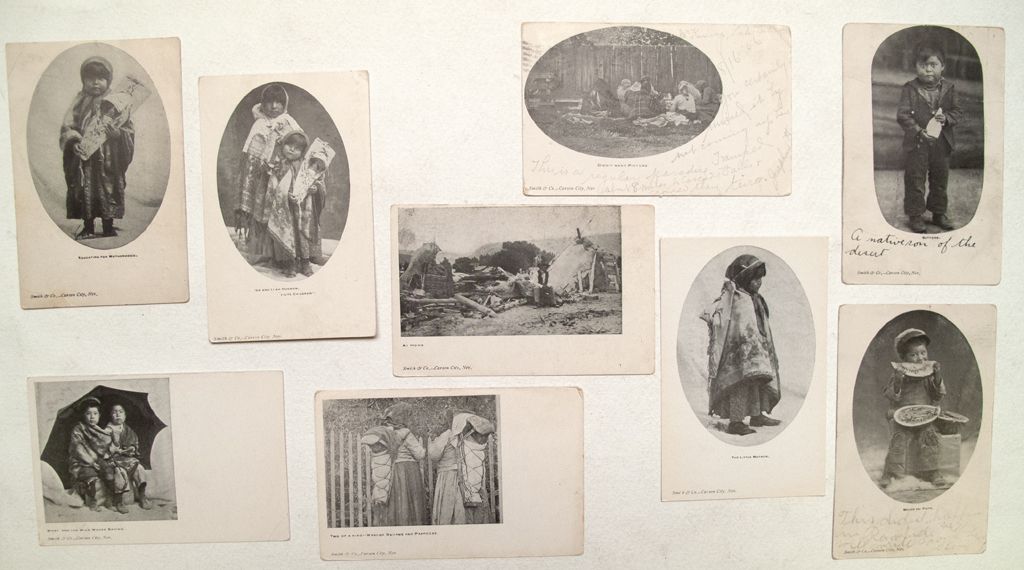 Six are of youngsters. One has two mothers and their papooses. Two more general scenes. All have titles. Printed by Smith & Company of Carson City. Two with 1907 Schurz, Nevada cancels. One with 1906 McKinney, California cancel.