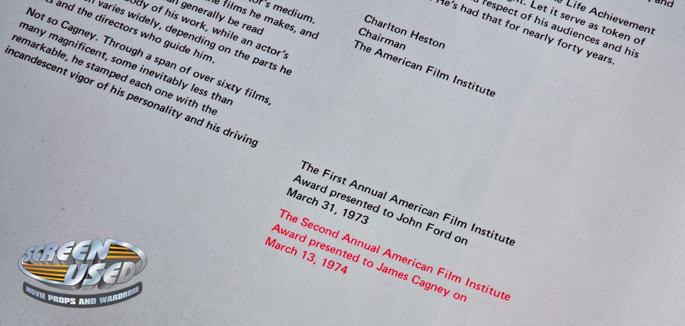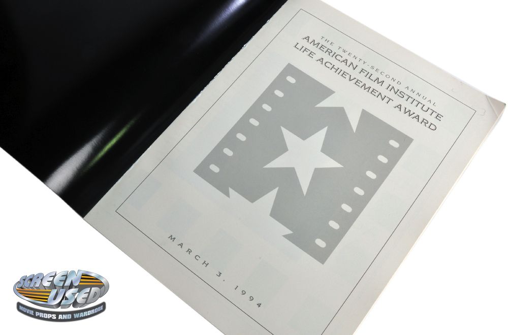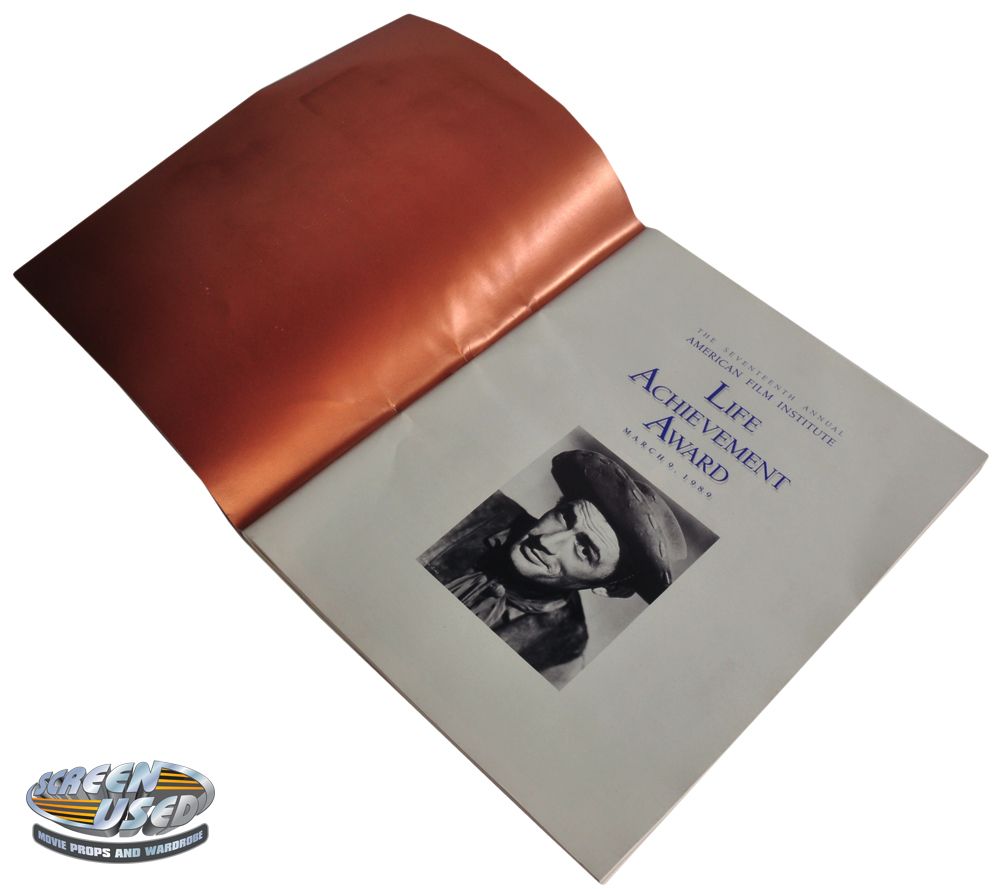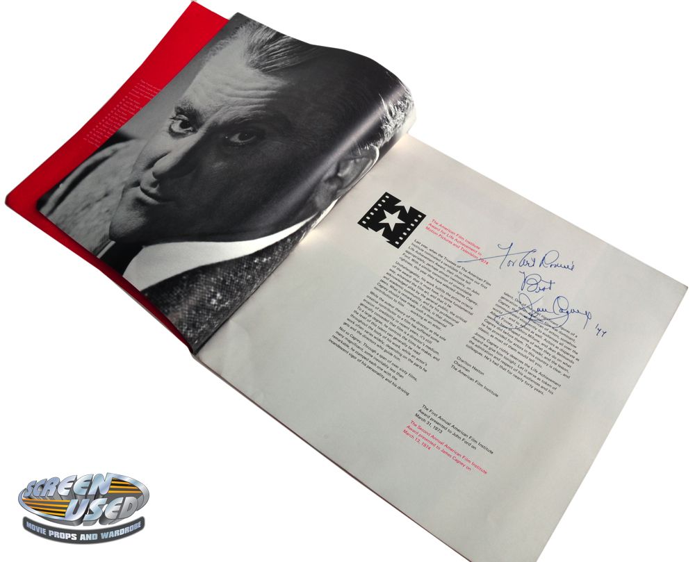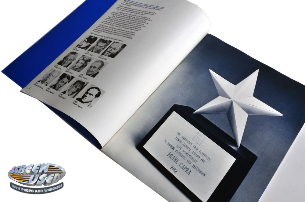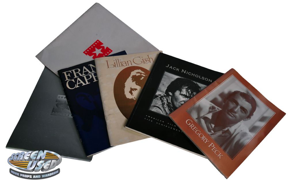 Set of six vintage program books from AFI's annual Lifetime Achievement Award presentations. Included are program books for James Cagney (1974), Alfred Hitchcock (1979), Frank Capra (1982), Lillian Gish (1984), Gregory Peck (1989), and Jack Nicholson (1994). James Cagney was the 2nd recipient of the AFI Lifetime Achievement Award, as it began in 1973 (John Ford). The Cagney program book is signed by Cagney in blue ink introduction page, "For Art Ronnie, Best, James Cagney '74." Each program exhibits minor wear. Otherwise, each in good condition.
