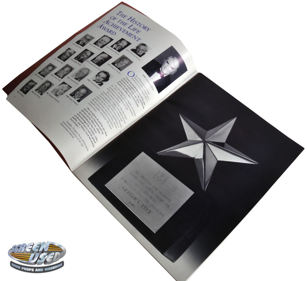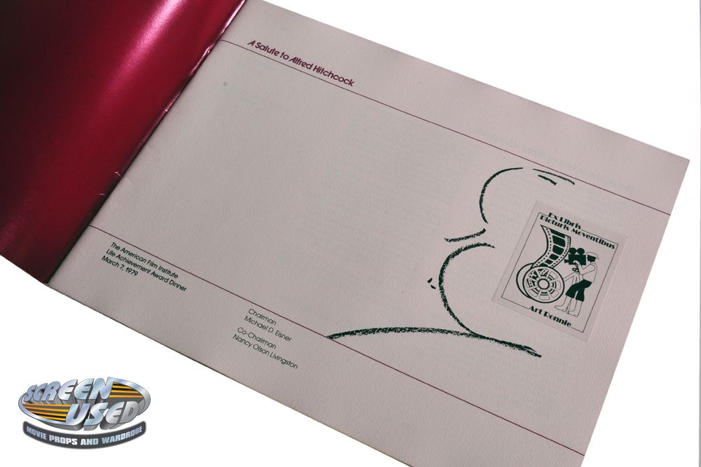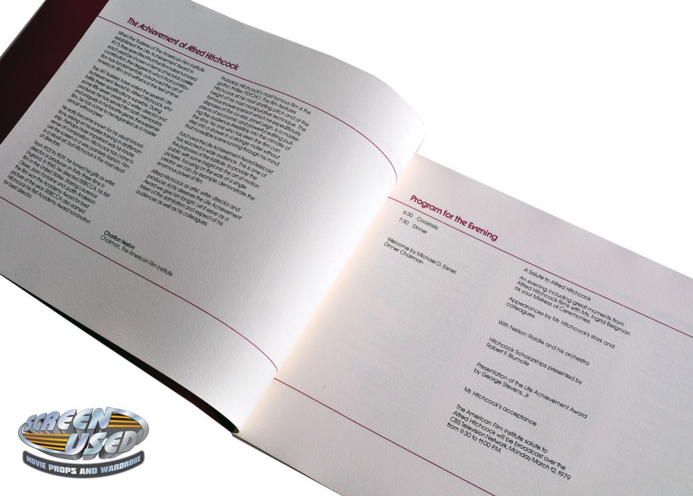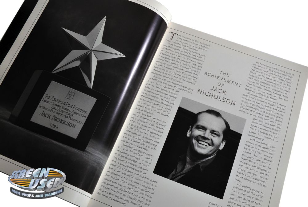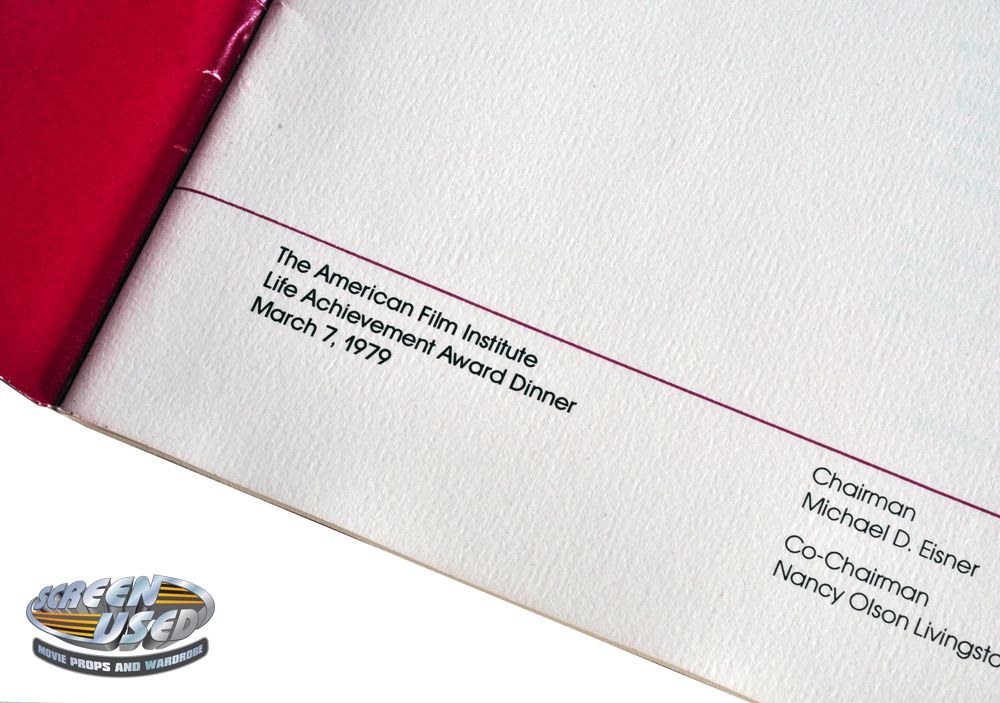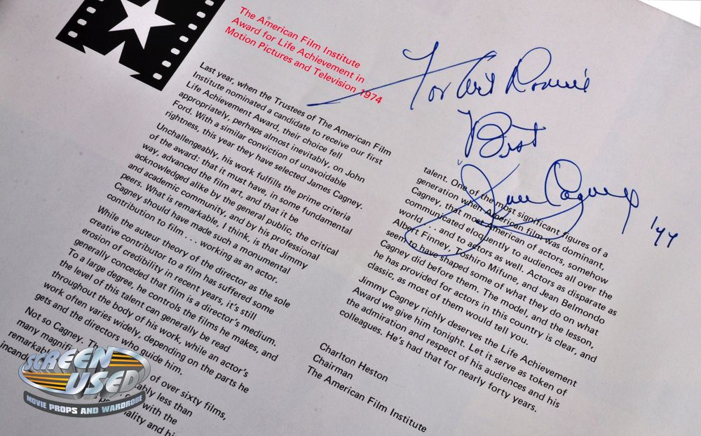 Set of six vintage program books from AFI's annual Lifetime Achievement Award presentations. Included are program books for James Cagney (1974), Alfred Hitchcock (1979), Frank Capra (1982), Lillian Gish (1984), Gregory Peck (1989), and Jack Nicholson (1994). James Cagney was the 2nd recipient of the AFI Lifetime Achievement Award, as it began in 1973 (John Ford). The Cagney program book is signed by Cagney in blue ink introduction page, "For Art Ronnie, Best, James Cagney '74." Each program exhibits minor wear. Otherwise, each in good condition.