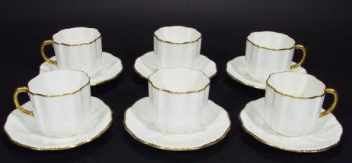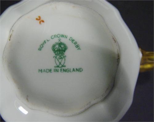 Set of six Royal Crown Derby Edwardian fluted cups and saucers with gilded decoration, printed facto