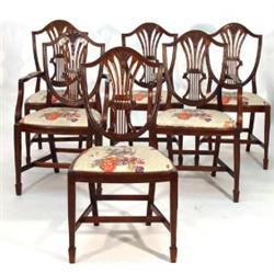 Set of six mahogany framed shield back wheatsheaf carved dining chairs with upholstered drop in seats on tapering legs with spade feet (to include two carvers)