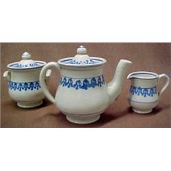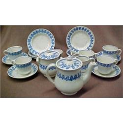 Set of spatterware doll's dishes, seventeen pieces including teapot, creamer (chip on base), five 5" plates (one with flake on rim), four saucers, six teacups (three with loss), 19th C. Estimate 500/900