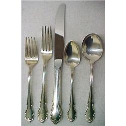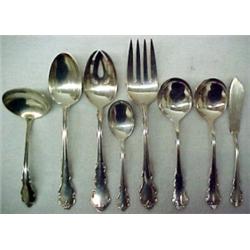 Set of sterling silver flatware International Silver Co. "Breton Rose" (1954) including eight dinner knives, eight dinner forks, eight salad forks, sixteen teaspoons, eight cream soup spoons, a butter knife, two round vegetable spoons, meat fork, sugar shell, oval serving spoon, oval pierced serving spoon, and a gravy ladle Estimate 400/700