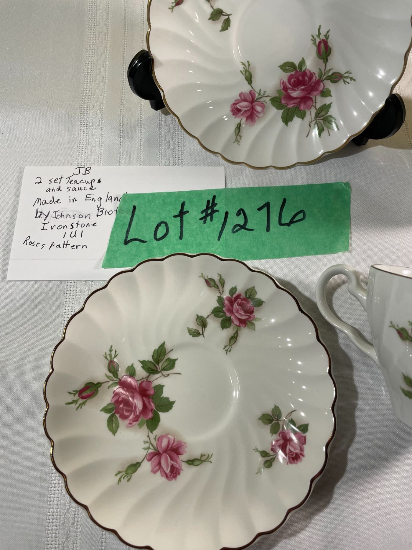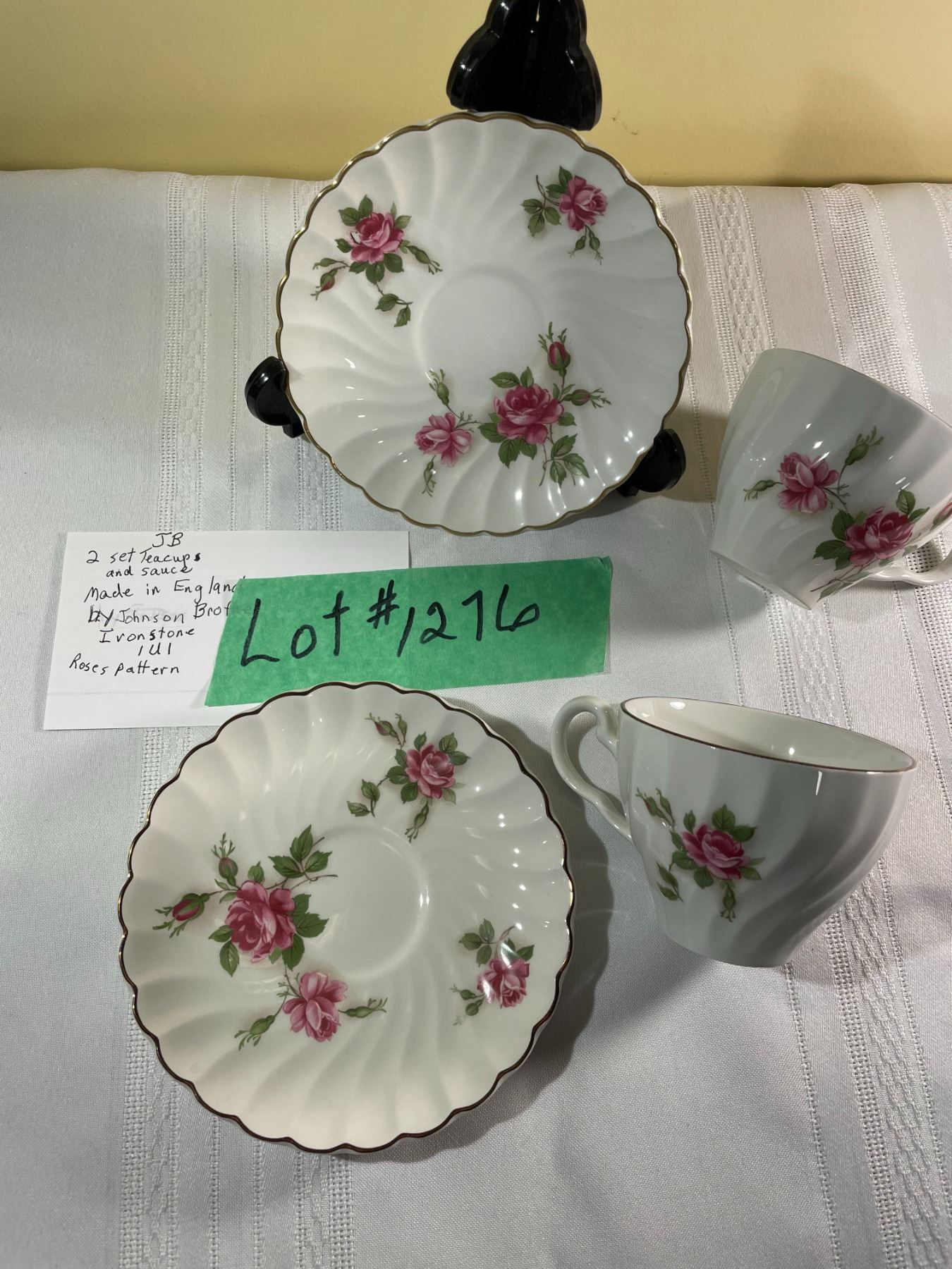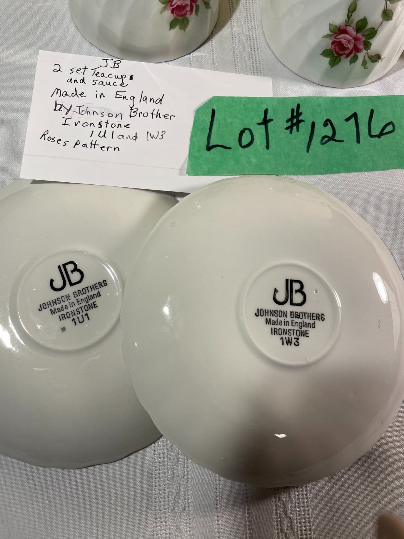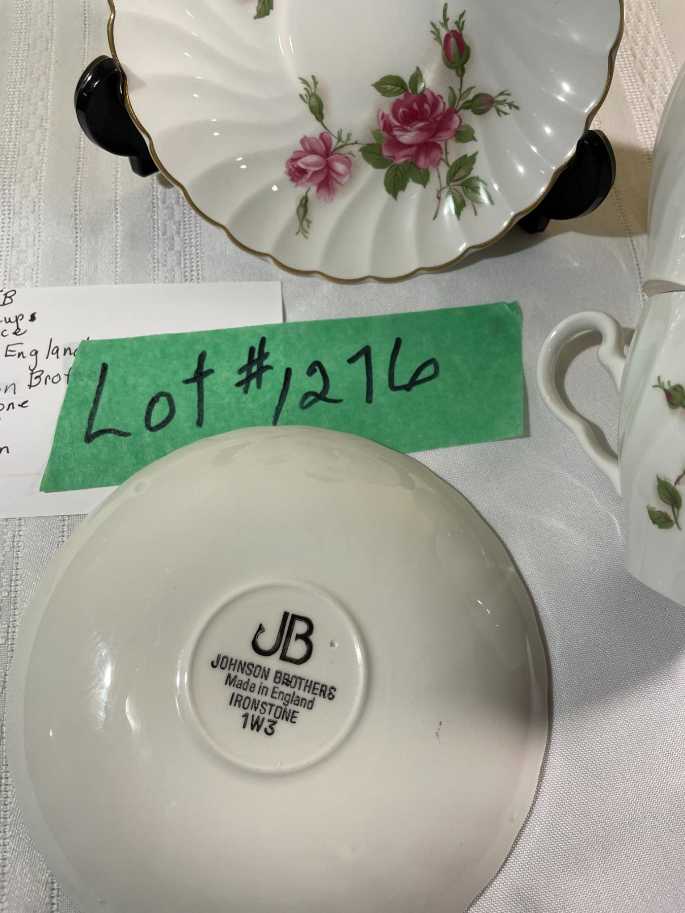 (2) Sets of Teacups and Saucers Made in England by Johnson Brothers Iron Stone 1 of 141 and 1 of w3 Saucers Rose pattern (1) Teacup only Johnson Brothers England Cream colour + Gold Trim on Rim + Handle