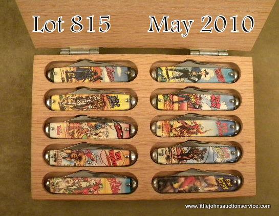 Set of ten Western commemorative pocket knives in wood case in overall good condition including Hopalong Cassidy, Tom Mix, Red Ryder, Lash LaRue, Gene Autry, Zorro, Wild Bill Hickock, Lone Ranger, Roy Rogers and Dale Evans. Est.: $75-$150.