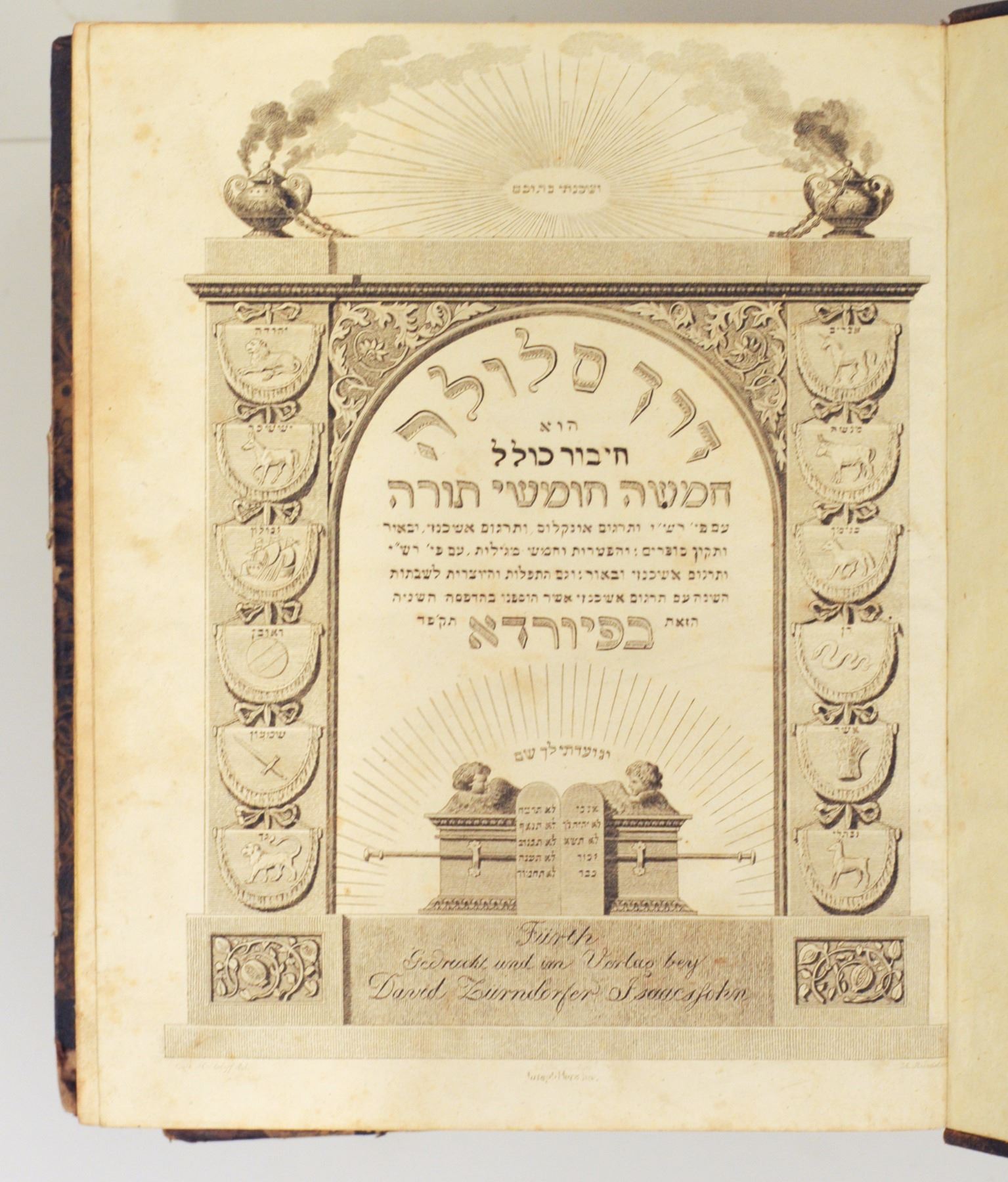 Set of the five Torah books with translation by Onkelos and commentary by Rashi, Ashkenazi explanations and explantions by Mendelson, Haftarot and five scrolls with an Ashkenazi translation and explanations of seder tefillot, with Ashkenazi translation of Tikun Sofrim, Moreh Derech and more. F?rth, 1824-1926. Each part has two title pages, the first is illustrated. Dimensions: 25 cm. The book Moreh Derech was first added to this edition. It consists of commentary to the Torah by Sefer Moreh Nevochim and a special title page. Housed inside original publisher's box. All books are intact, in very good condition, bindings and enpapers slightly worn. Very distinguished edition. Extremely rare to find the complete set!