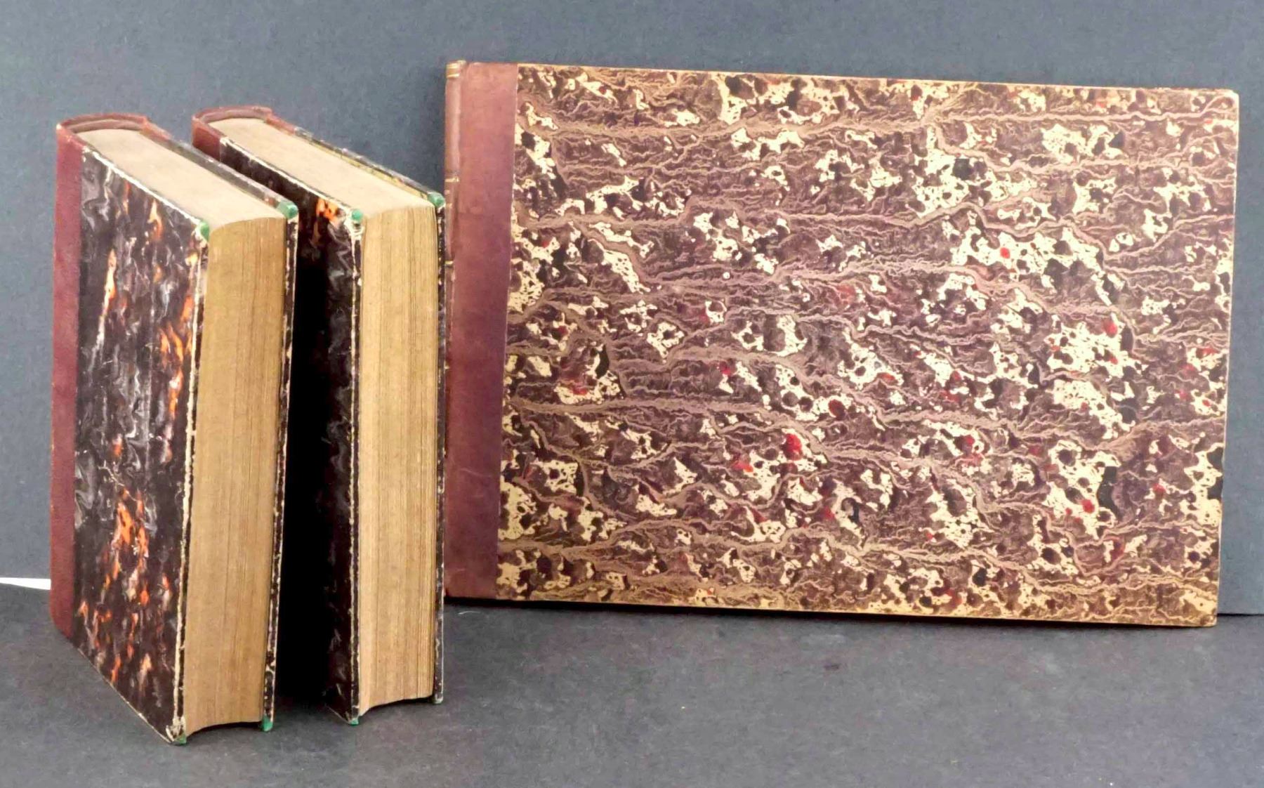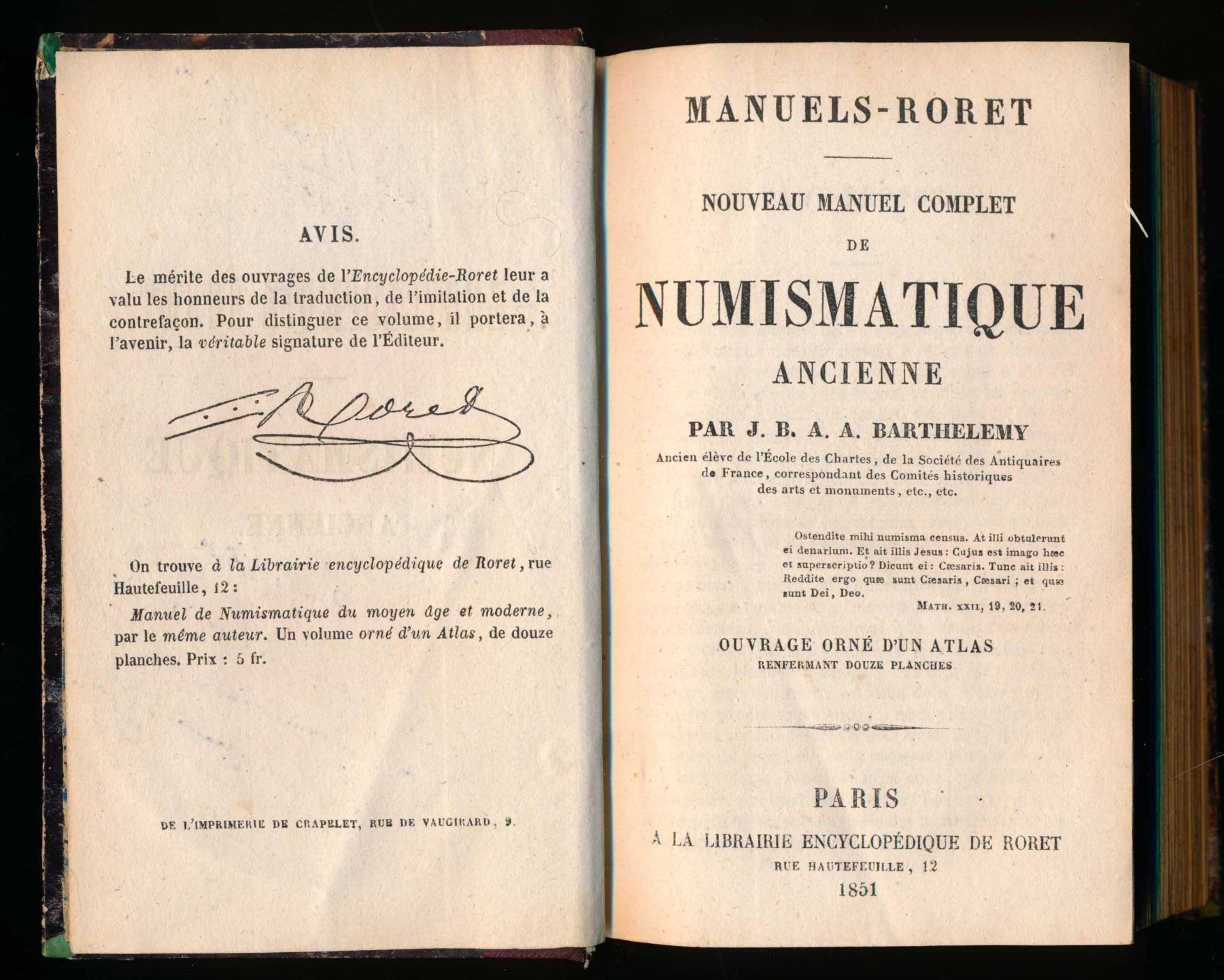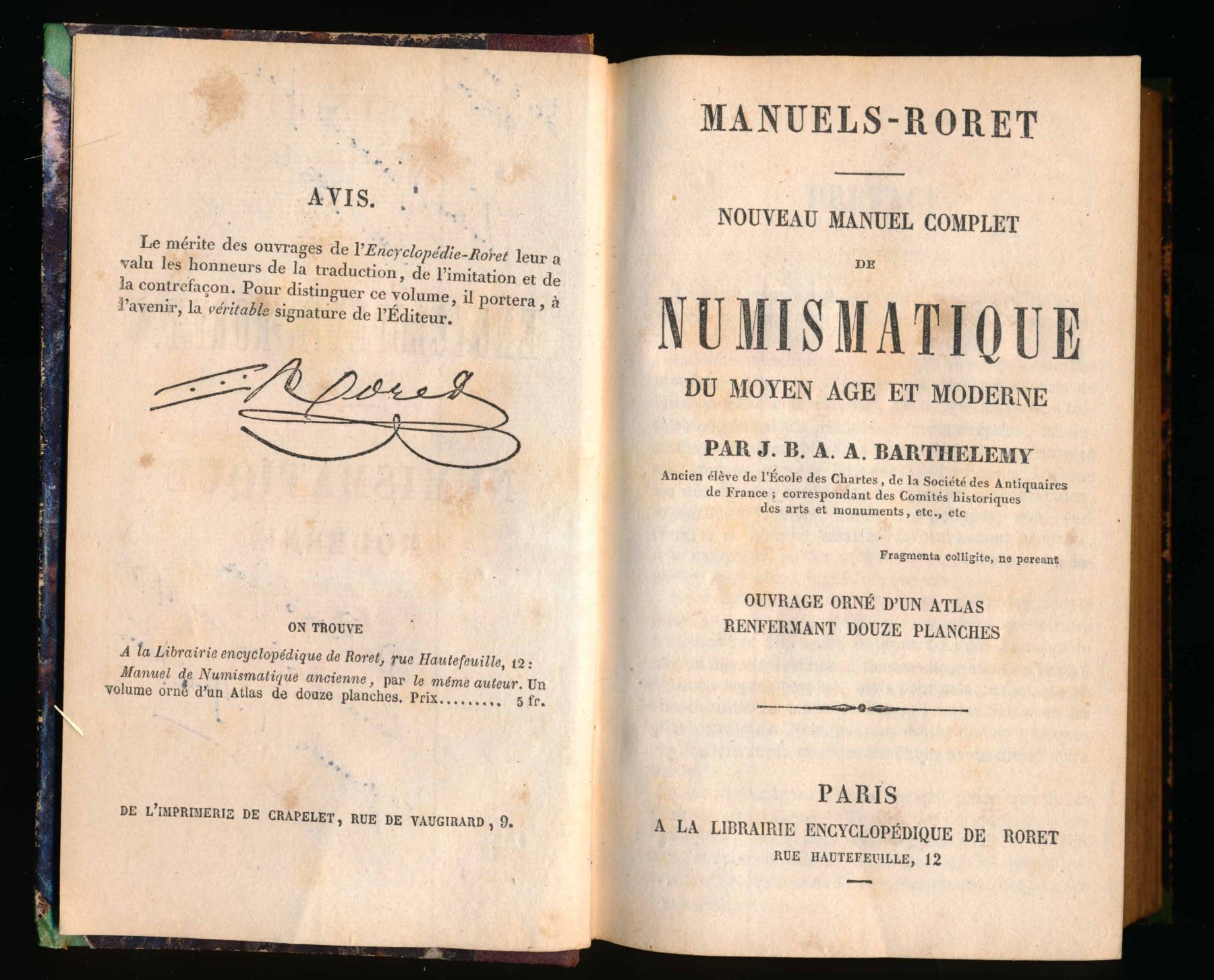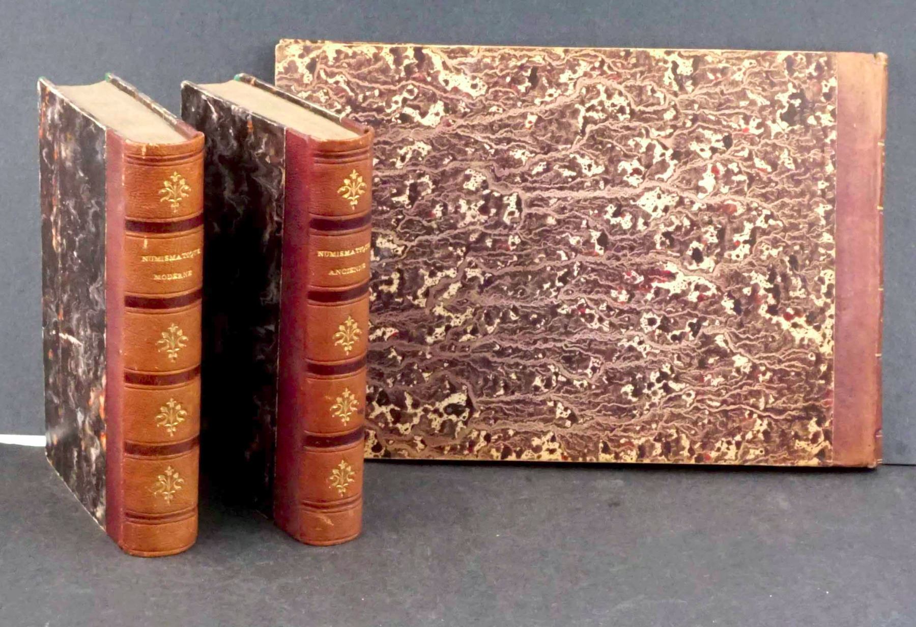 SET OF THREE BOOKS : NOUVEAU MANUEL COMPLET de NUMISMATIQUE ANCIENNE (Part 1) and MODERNE (Part 2) - ATLAS - par B. B. A. A. BARTHELEMY PARIS. A volume of pull-out plates of coin drawings. PLUS : Two small volumes : Manuel - Roret NUMISMATIQUE ANCIENNE (1851) and NUMISMATIQUE MODERNE (ND) by the same author. Each volume has some notation from Father Marcotte on the first page. The Atlas, or book of plates, has some staining or humidity marks on the first few pages, and the first plate is entirely filled with notes on the back. Both text volumes are over 450 pages each, in excellent condition. All three have nice matching board and leather bindings