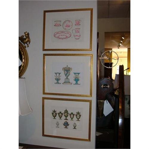 Three lovely hand colored prints of Sevres porcelain, two of urns and one of variuos pieces of porcelain. Wonderful pink, blue and green colors. Each are titled "SEVRES". New gold frames. Please feel free to e-mail for additional photos.