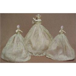 Set of three porcelain boudoir doll lamp shades, larger doll measures 11" high, all porcelain doll tops are 1/2 dolls to waist, metal frame supports doll and is covered with three fabric layers and are placed over candle stick type lights, smaller dolls measure 8" complete