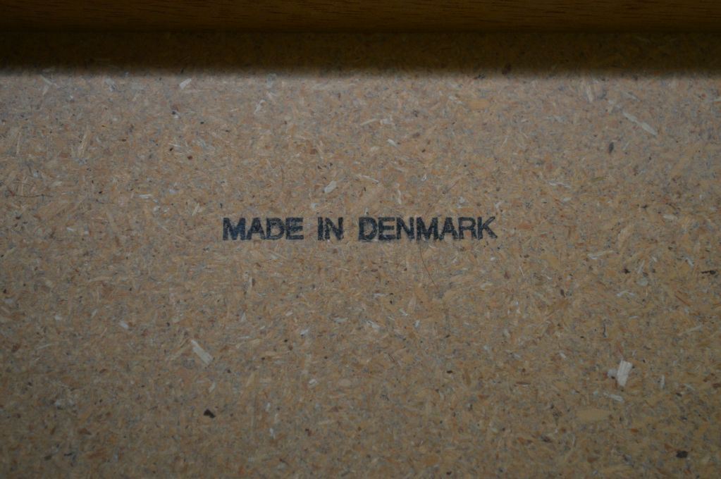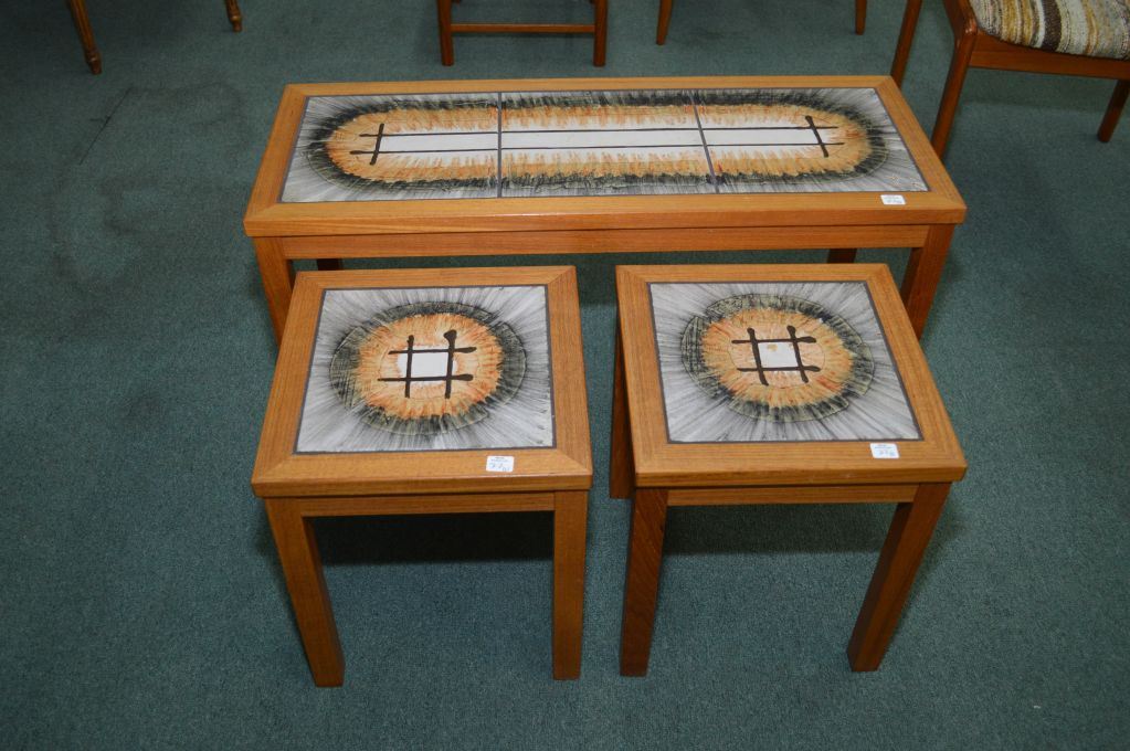 Set of three teak framed Danish made nesting table inset with hand painted tiles monogrammed with artist M.K