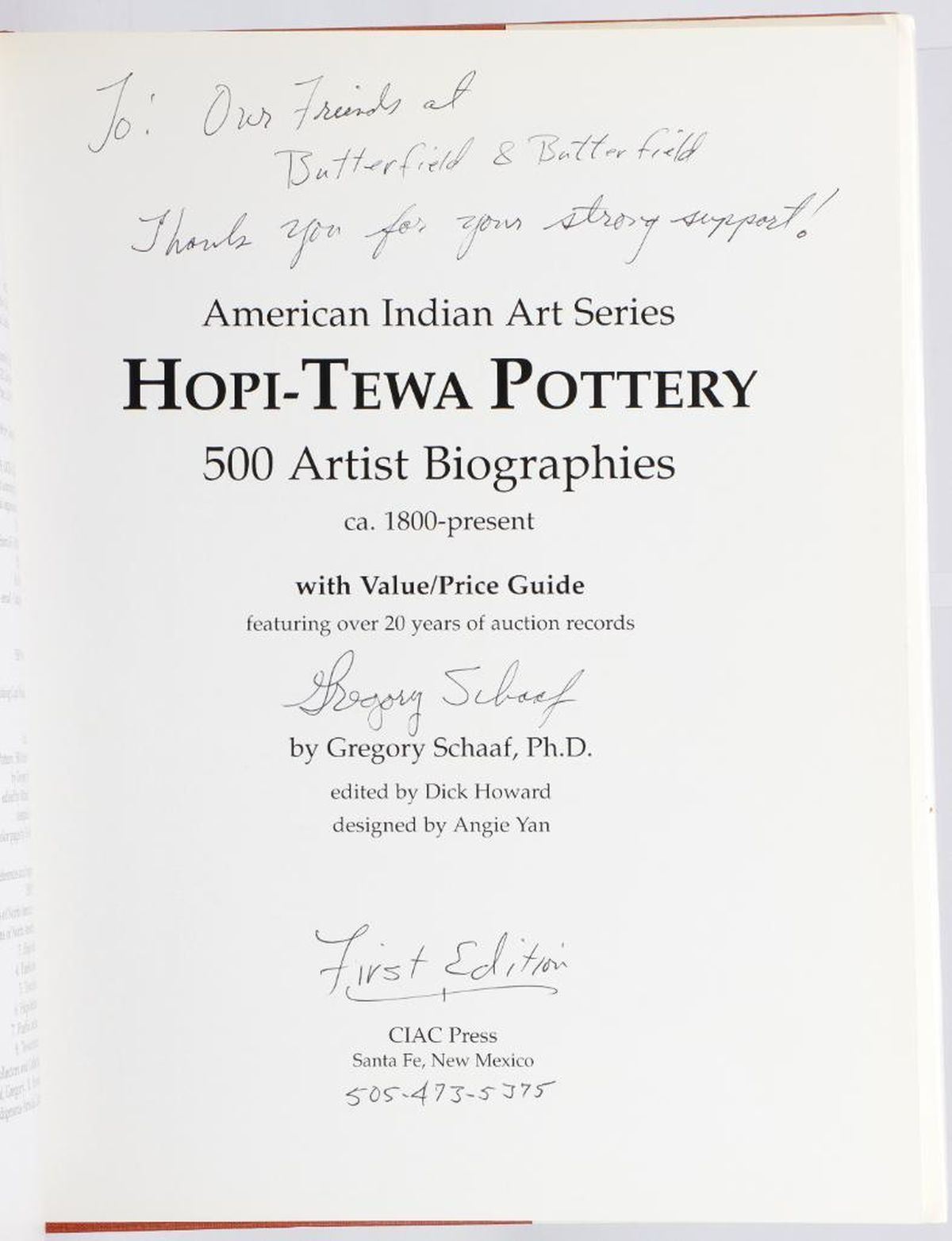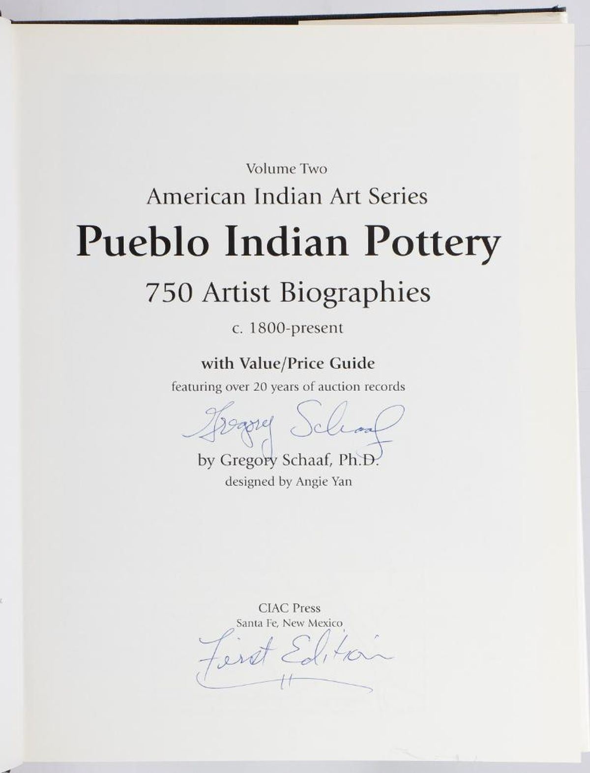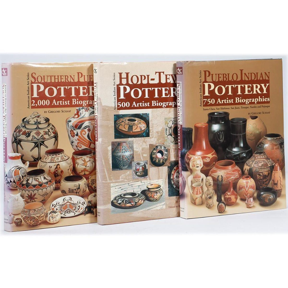 Set of three volumes on Pueblo pottery. SCHAAF, GREGORY. American Indian Art Series: 1.) Hopi-Tewa Pottery, 500 Artist Biographies ca. 1800-present. Santa Fe: CIAC Press, 1998. Stated first edition. Signed/inscribed by the author. 2.) Pueblo Indian Pottery, 750 Artist Biographies, c. 1800-present. Volume Two. Santa Fe: CIAC Press, 2000. Stated first edition. Signed/inscribed by the author. 3.) Southern Pueblo Pottery, 2,000 Artist Biographies, Featuring: Acoma, Cochiti, Isleta, Jemez and Pecos, Laguna, Sandia, San Felipe, Santa Ana, Santo Domingo, Tigua/Ysleta del Sur, Zia and Zuni. Volume Four. Santa Fe: CIAC Press, 2000. Stated first edition. Condition: Good-Very Good; these volumes are from a well-used research library; some light toning; one with owner's signature; edge creases, sun fading to dust jackets.