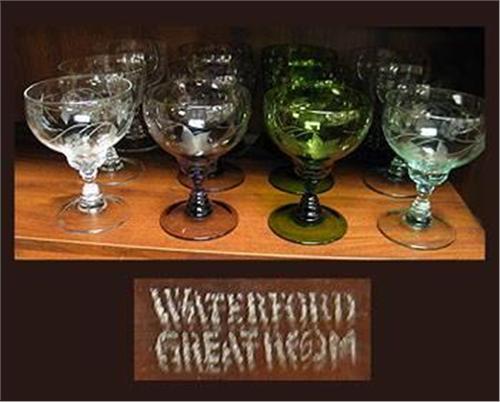 Set of twelve signed Waterford wheel cut "Great Room" goblets in four mix and match colors. No chips or cracks. They stand 6" tall