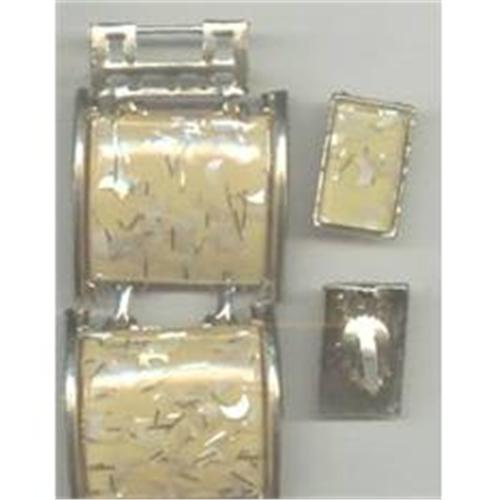 Bracelet and ear ring set. Curved lucite plagues with a yellow background and gold confettie and shell chips imbeded in them. The bracelet is aprox. 7 1/2" X1 3/4". The ear clips are aprox. 1"X 3/4". The goldtone finish is in very good condition.