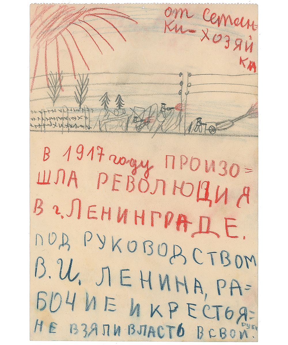 Pictorial autograph manuscript signed, “from Setanka-Housekeeper” in Russian, one page, 5.25 x 7.75, circa mid-1930s. In regular and colored pencil, Setanka has drawn a sun in the upper left corner and a battle scene of the 1917 Russian Revolution, showing gunfire on both sides in red. Captioned under the battle scene, in full: [in red] “In year 1917, the Revolution came about in the city of Leningrad.” [in blue] “Under the leadership of V.I. Lenin, workers and peasants took over.” In fine condition.