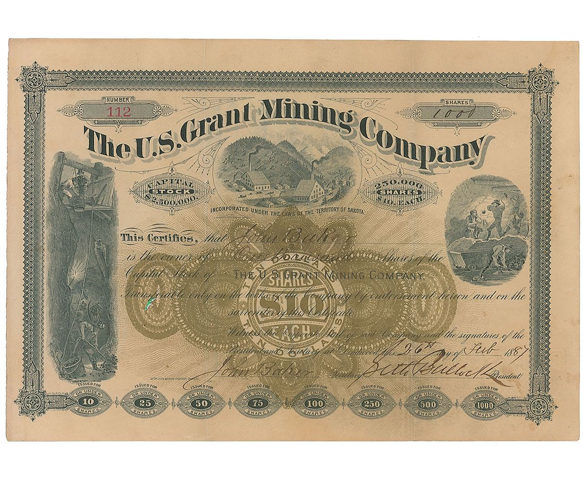 Western legend (1849–1919) who beat out Wyatt Earp for the position of first sheriff of the notorious Deadwood camp. Partly-printed DS, one page, 11 x 7.75, February 26, 1887. Certificate confirming that “John Baker is entitled to One thousand Shares of the Capital Stock of The U. S. Grant Mining Company.” Signed at the conclusion by Bullock as president of the company and countersigned by a secretary. In fine condition, with two vertical storage folds (one passing through a single letter of the signature) and a few trivial stains.