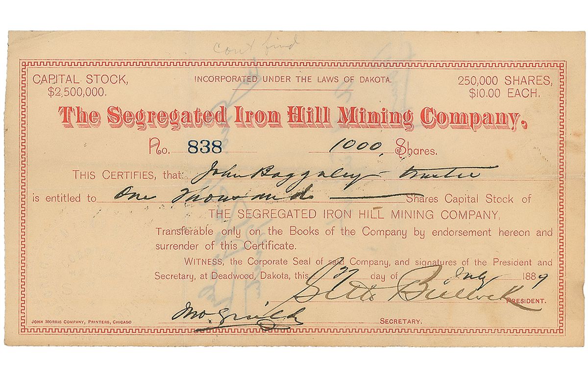 Western legend (1849–1919) who beat out Wyatt Earp for the position of first sheriff of the notorious Deadwood camp. Theodore Roosevelt once said that Bullock was a ‘true westerner, the finest type of frontiersmen.’ Partly-printed DS, one page, 7.75 x 4.25, July 27, 1889. Certificate confirming that “John Baggaley trustee is entitled to One thousand Shares Capital Stock of The Segregated Iron Hill Mining Company.” Signed at the conclusion by Bullock as president of the company and countersigned by a secretary. In fine condition, with intersecting folds and expected document wear.