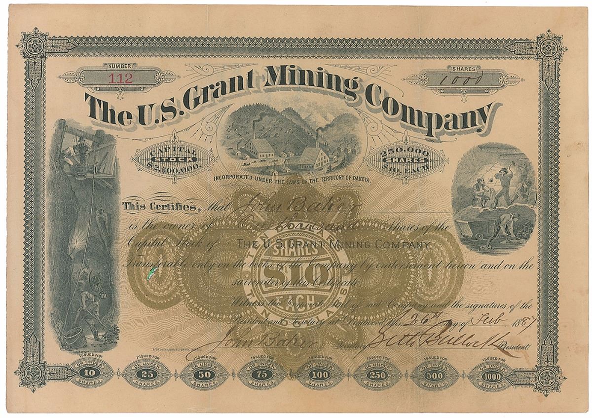 Western legend (1849–1919) who beat out Wyatt Earp for the position of first sheriff of the notorious Deadwood camp. Partly-printed DS, one page, 11 x 7.75, February 26, 1887. Certificate confirming that “John Baker is entitled to One thousand Shares of the Capital Stock of The U. S. Grant Mining Company.” Signed at the conclusion by Bullock as president of the company and countersigned by a secretary. In fine condition, with two vertical storage folds (one passing through a single letter of the signature) and a few trivial stains.