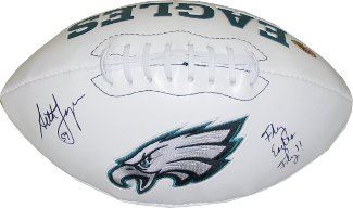 Seth Joyner was drafted by the Philadelphia Eagles in the eighth round of the 1986 NFL Draft. Joyner's unique combination of strength and quickness allowed him to excel in all defensive statistical categories and propelled him to three Pro Bowl accolades; being selected in 1991, 1993, and 1994. In 1991 he was named NFL Player of the Year by Sports Illustrated and received runner-up honors for Associated Press NFL Defensive Player of the Year. Seth Joyner has hand signed this Philadelphia Eagles Logo Football with Fly Eagle Fly Inscription. MAB Hologram and Certificate of Authenticity from Athlon Sports.