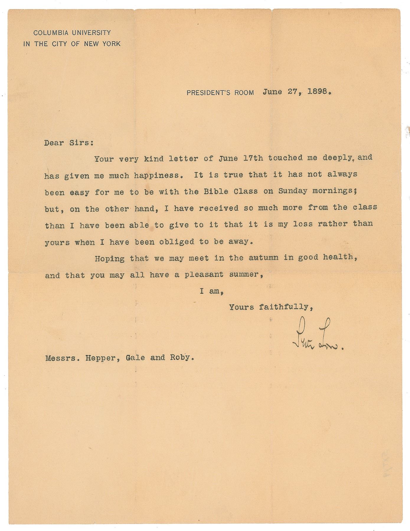 TLS, one page, 8 x 10.25, Columbia University, President's Room letterhead, June 27, 1898. Letter to "Messrs. Hepper, Gale and Roby," in part: "It is true that it has not always been easy for me to be with the Bible Class on Sunday mornings; but, on the other hand, I have received so much more from the class than I have been able to give to it that it is my loss rather than yours when I have been obliged to be away." In fine condition.