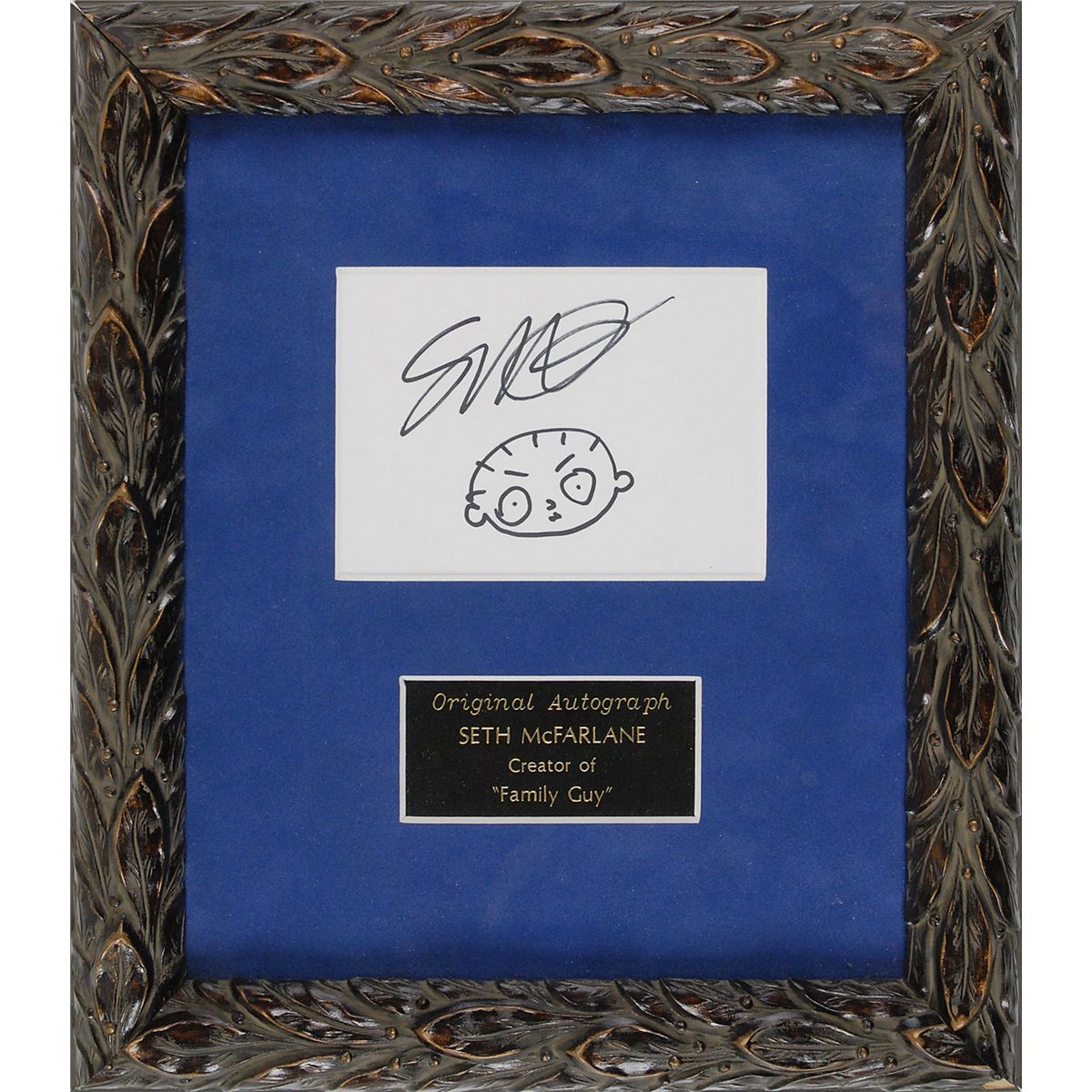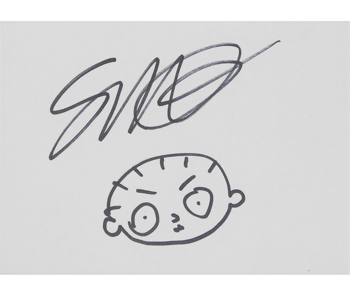 Original signed felt tip sketch of Stewie Griffin on a white 5.5 x 4 card. Suede-matted and framed with a small plaque to an overall size of 12.5 x 14.5. In very fine condition. Originally obtained by in-person specialist Mike Wehrmann.