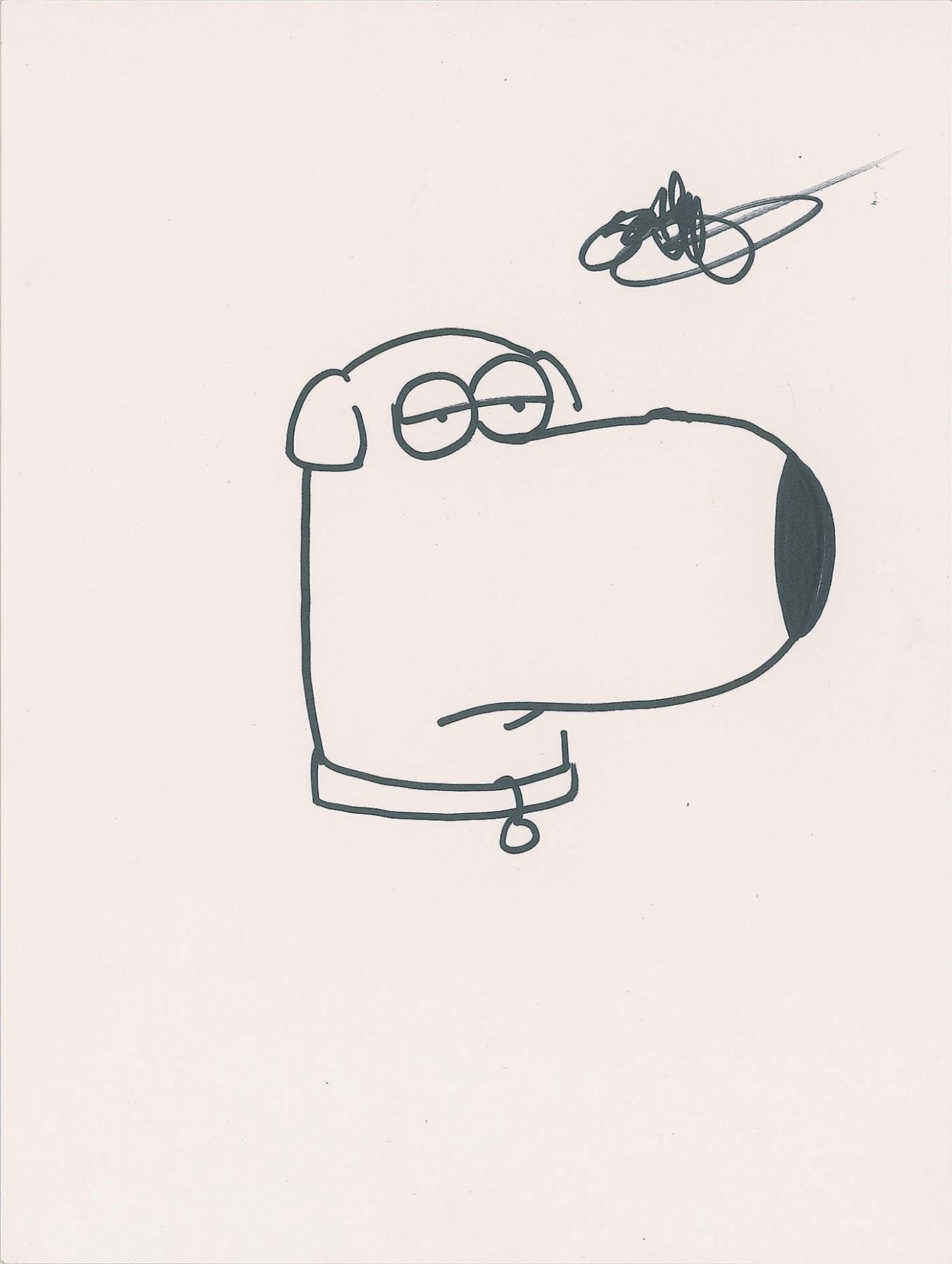 Original felt tip sketch of an unenthused Brian Griffin from the show Family Guy, accomplished on a white 9 x 12 sheet by Seth MacFarlane, who signs above. In very fine condition.