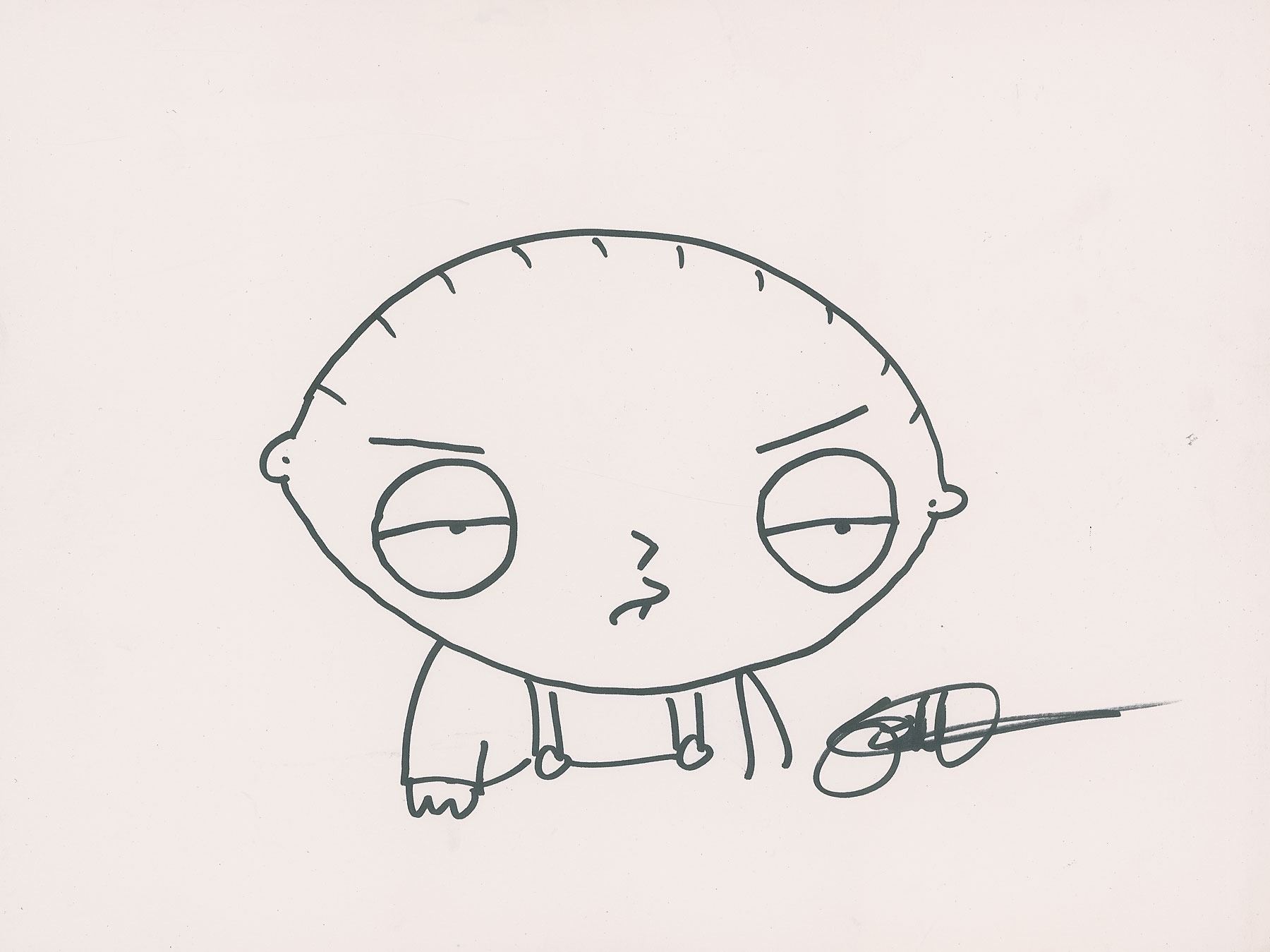 Fantastic original felt tip sketch of an entirely displeased Stewie Griffin from the animated television series Family Guy, accomplished on a white 12 x 9 sheet in black felt tip by Seth MacFarlane, who signs below. In very fine condition.