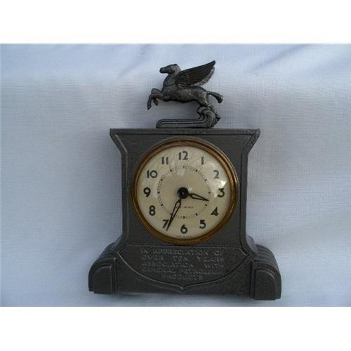 </font></strong>Seth Thomas 8 Day Wind Clock. This is a cast metal/iron 5.5lb. clock. The clock was a presentation piece from General Petroleum. The quote reads "In Appreciation of Over Ten Years Association with General Petroleum Products". This clock was made sometime after 1952, which is when General Petroleum started business. It has a gray hammered finish with Pegasus on top.(Flying A, or Mobil?) Clock works great. Great piece for clock, advertising or petroleum collectors. See photos. Have a look at my other items. Thank you for viewing. </font>