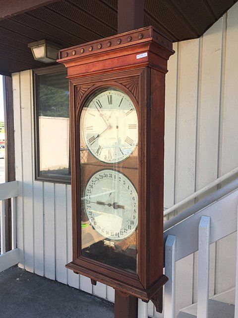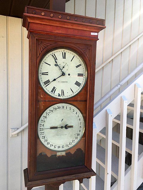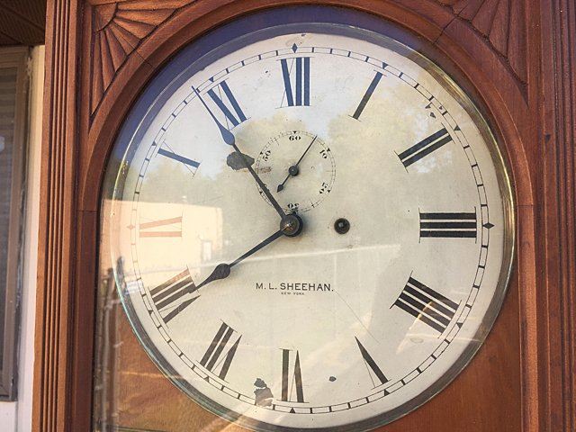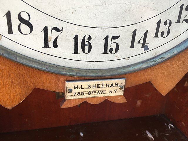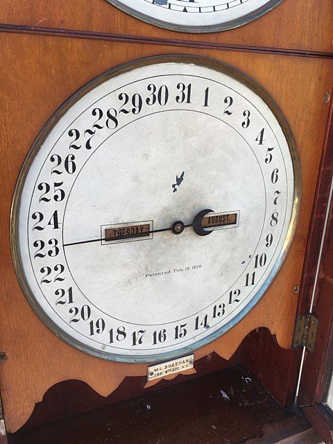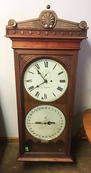Beautiful Seth Thomas Double Dial No. 13 Office Calendar Wall Clock. Cherry case with carved corner spandrels and carved lower bracket, metal name tag "M.L. Sheehan, 785 8th Ave., NY" a fine jeweler of the time. Weight driven with calendar dial, 8 day clock. This clock would have been a prominent feature in fine establishments, law firms, banks, and will make a wonderful focal piece for any home! Measures approx. 46" tall x 18" wide x 8" deep.