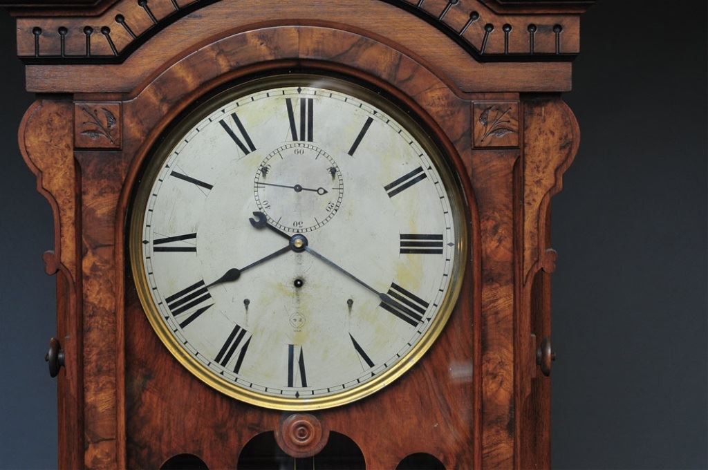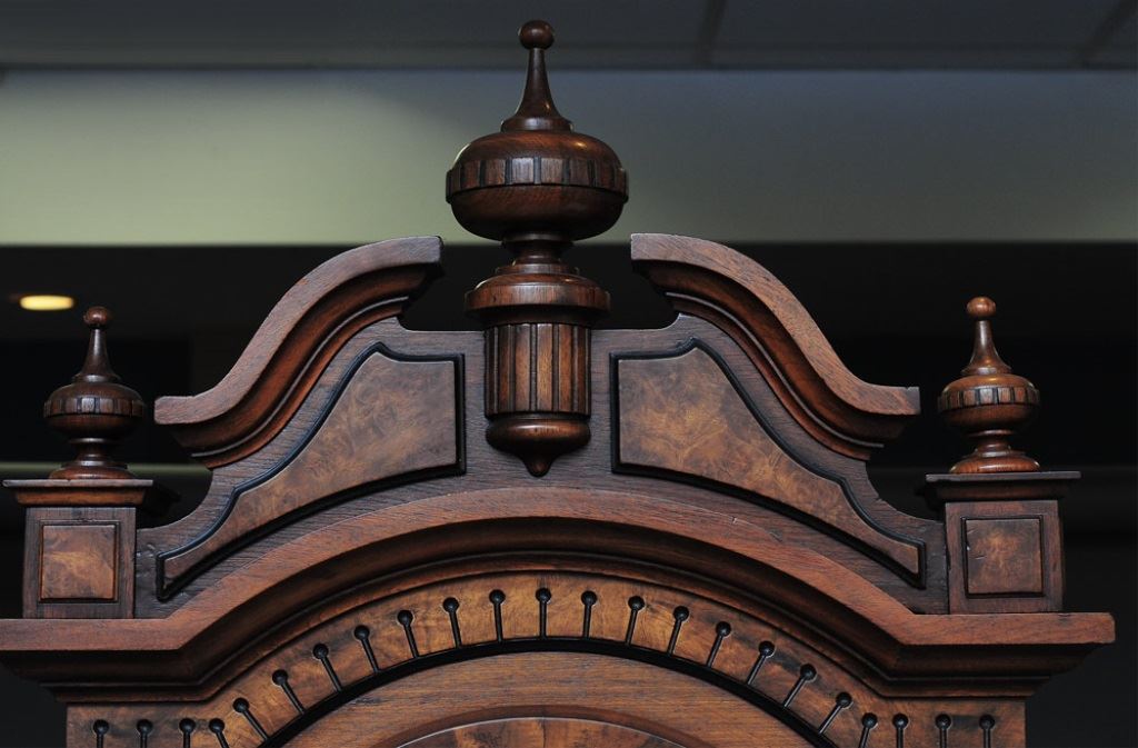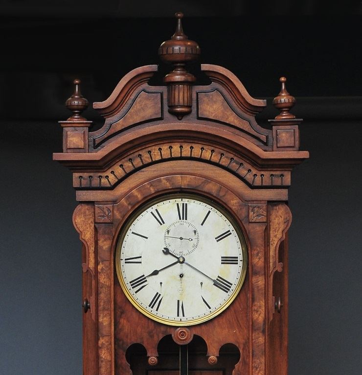 CONDITION REPORT: old refinish with minor rubs and dings, original finials, second hand and rod possibly replaced