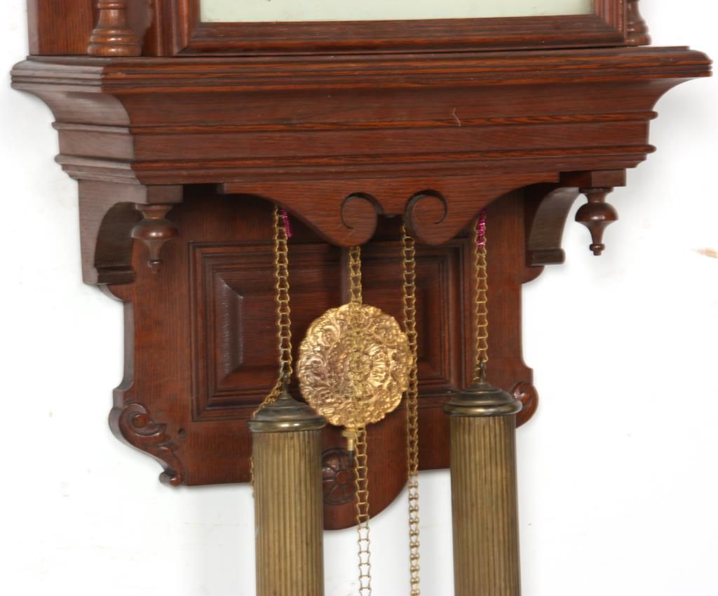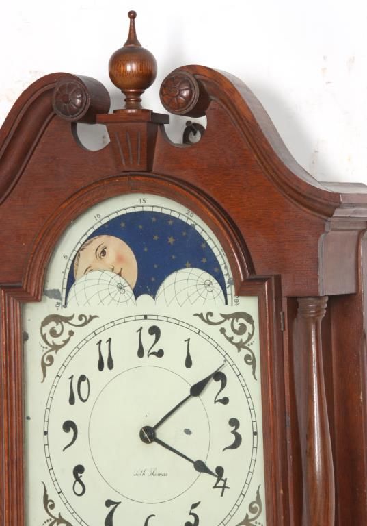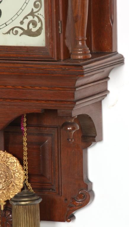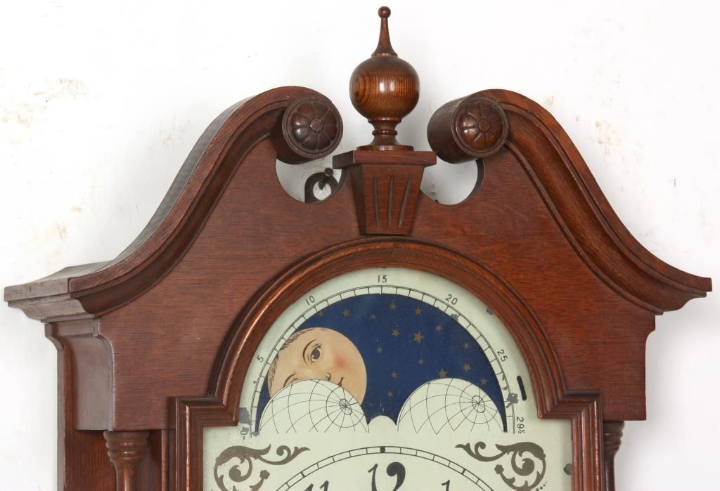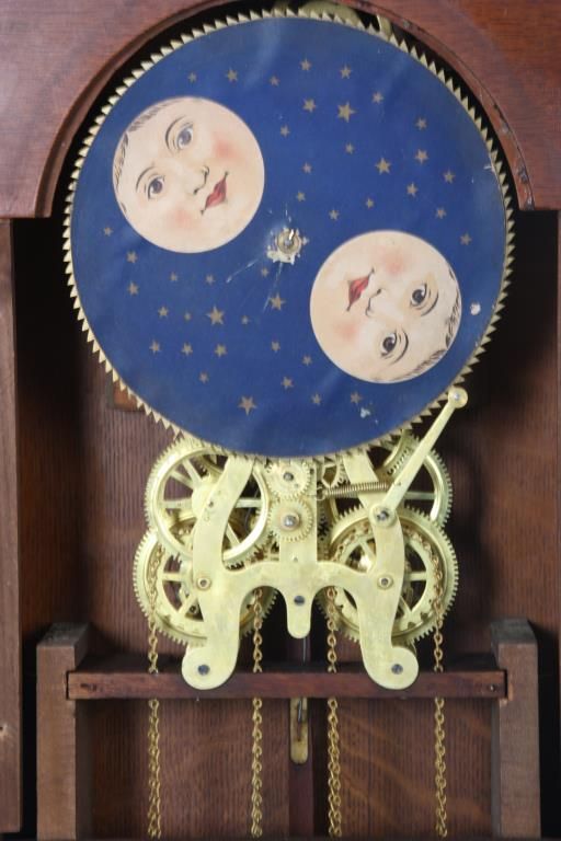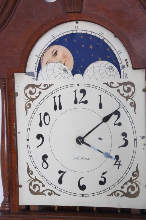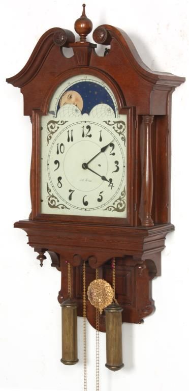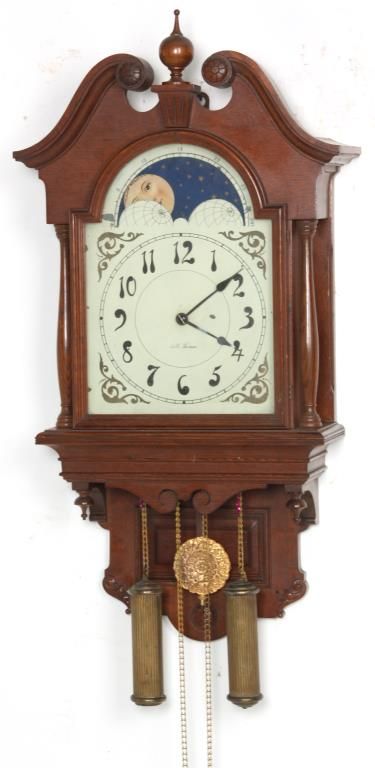 Seth Thomas “Lunar” Oak Wall Clock. Painted metal dial has a 9.5 in. chapter ring with black Arabic hour numbers, spade hands, gilt filigree spandrels and moon phase dial; pierced brass lyre shaped weight driven movement with half hour strike on a coiled gong with coiled mounting bracket, movement signed S. Thomas, Thomaston CT. has brass covered weights, & pendulum bob with wood pendulum stick. Carved oak case with broken arched crest, turned finial in the center and turned columns on either side of the door with teardrop finials at the bottom. In good condition and original finish. 36 in. high x 19 in. wide x 16.5 in. deep.