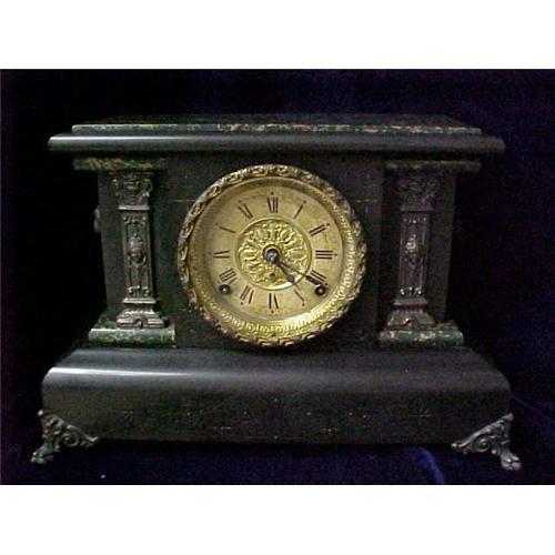 Seth Thomas Mantel Clock - Exquisite! Made of wood with veneer accents, does include key. The clock is black with marble like veneer in black with warm green and orange compliments. Lion head handles and feet.