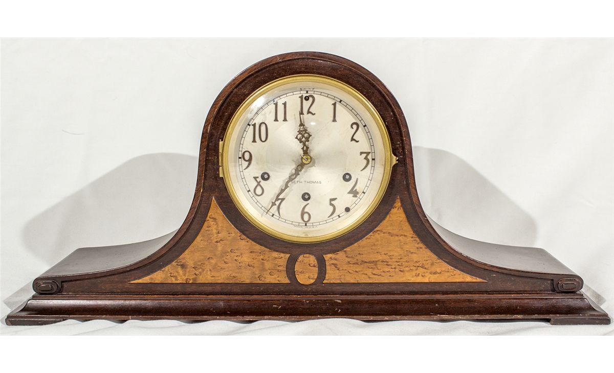 c1930 Beautiful mantle clock from the famous Seth Thomas clock makers. Camelback case with burl inlays. It features a Westminster 124 8-Day striking movement, which was overhauled in 2006. Approx. 21" wide at the base, and 10" high at the top. This piece is in excellent condition. Fairbanks Collection - HKA#66070
