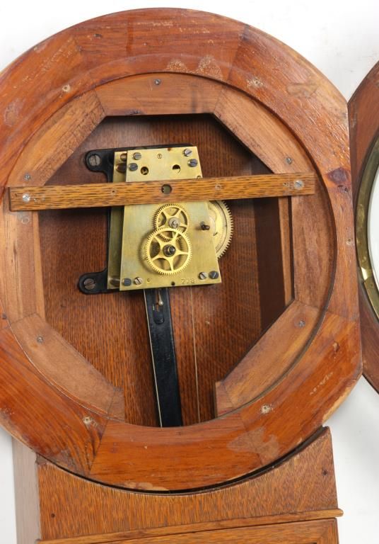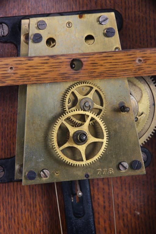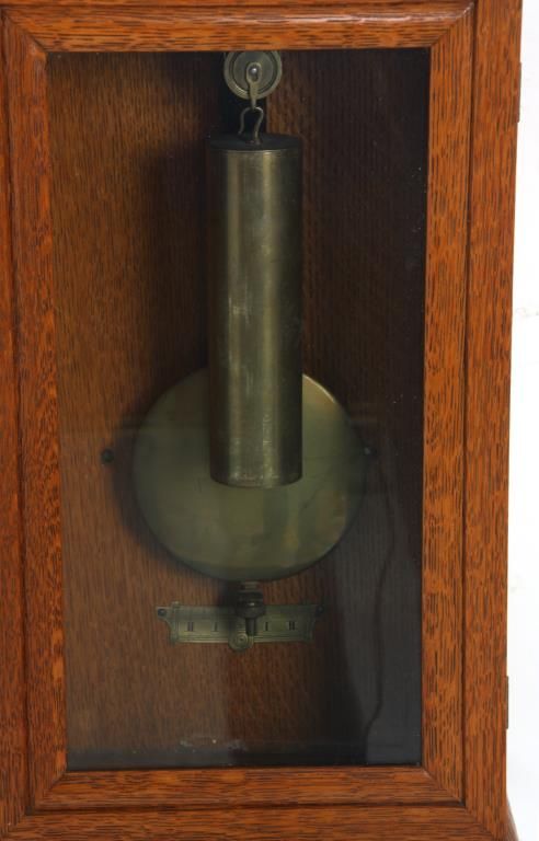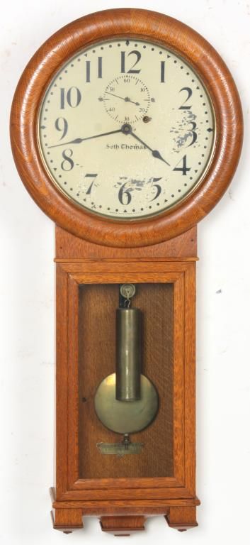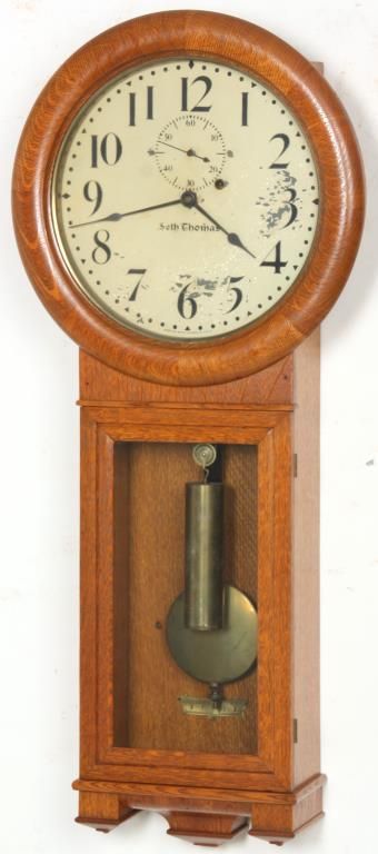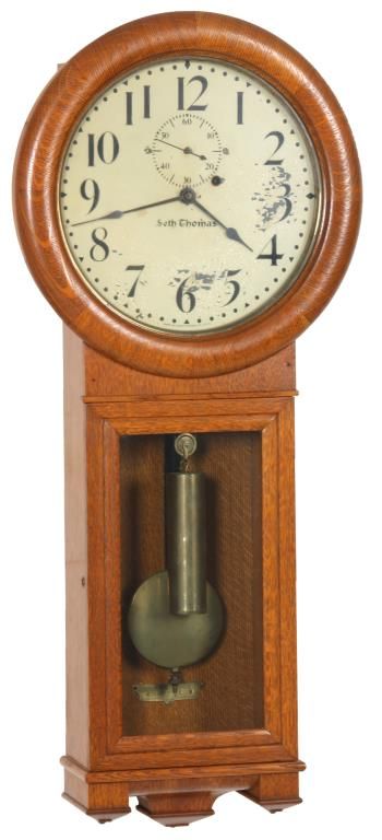 Seth Thomas No. 2 Oak Regulator. 12 in. painted metal dial has black hour numbers, sub seconds dial, signed Seth Thomas and blued spade hands; brass, 8 day, weight driven, time only movement No. 77B, has deadbeat escapement, retaining power, long ebonized wood pendulum rod with brass covered bob, brass weight, brass pulley and signed with paper label in the bottom of the case. Oak case has a round door bezel with long drop, in good conditionwith original finish dial. 37 in. high x 16 in. wide x 6 in. deep.