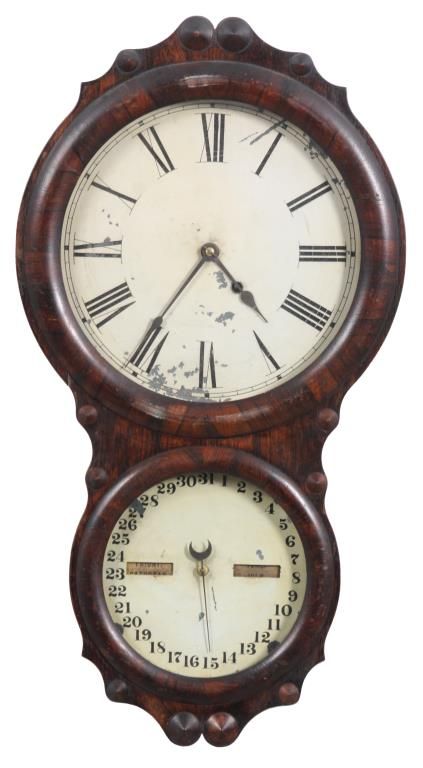 Seth Thomas No. 4 Double Dial Clock. 12 in. painted metal dial has black Roman hour numerals, original blued spade hands; 8 day brass spring driven time only movement is signed S. Thomas, Plymouth, Conn. USA. 8 in. painted metal lower calendar dial has 31 black painted date numbers and open apertures exposing the month and day cylinders of the perpetual calendar mechanism. In a rosewood, figure eight style case mounted with turned conical rosettes on the crests and sides; in original finish and good overall condition, original hands are tarnished, original dials have some scratching and has original calendar labels. 28 in. high x 15 in. wide x 4.5 in. deep.