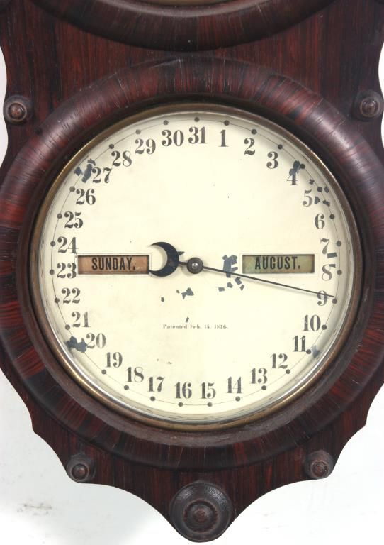 Seth Thomas Office Calendar No. 7 Double Dial Wall Clock. Original 10 in. painted metal upper dial has black Roman hour numerals and is signed Seth Thomas, has blued spade hands; 8 in. lower calendar dial has 31 date Arabic numbers with cutout apertures exposing the month and day of the week, original paper labels on the calendar barrels, perpetual calendar mechanism is in very good working condition. Brass, spring driven, movement No. 5 7/8, signed S. Thomas, Thomaston, Conn. USA., has an hour count wheel strike mechanism with an iron bell, brass covered pendulum bob, in good running condition; dials have some flaking and inpaiting in the centers. In a figure eight style rosewood case with serpentine crests and turned rosette mounts; in good condition and original finish. 26.5 in. high x 13 in. wide x 4.5 in. deep.