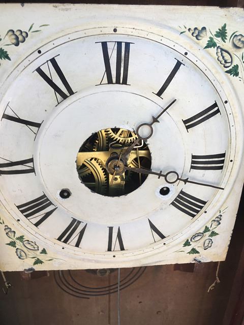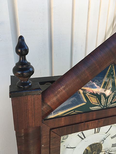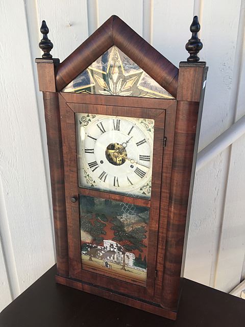 Seth Thomas, Plymouth, CT, 30 hour time/strike steeple top shelf clock, with brass movement. c. 1845. Weight driven, with pendulumn and key, wooden finials, reverse painted glass on top and bottom (some loss), "Residence of Ithial Town, Esq. New Haven" on bottom glass. Nice, hand painted dial, measures approx. 29" tall x 14 1/2" wide x 4" tall.