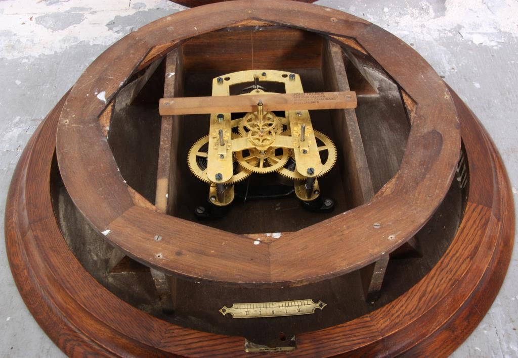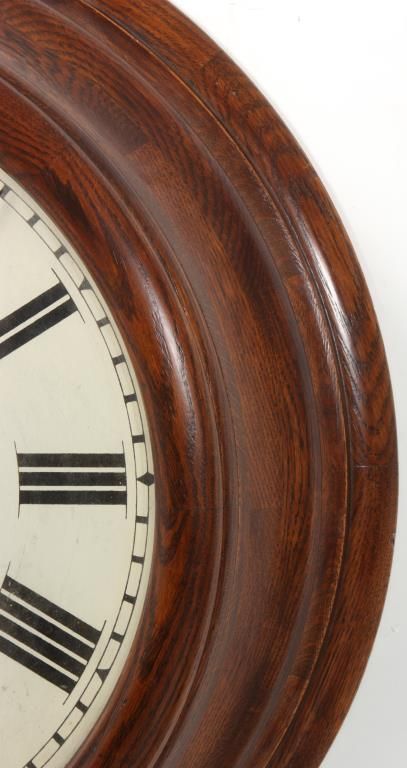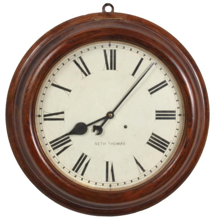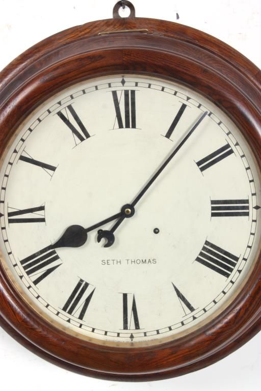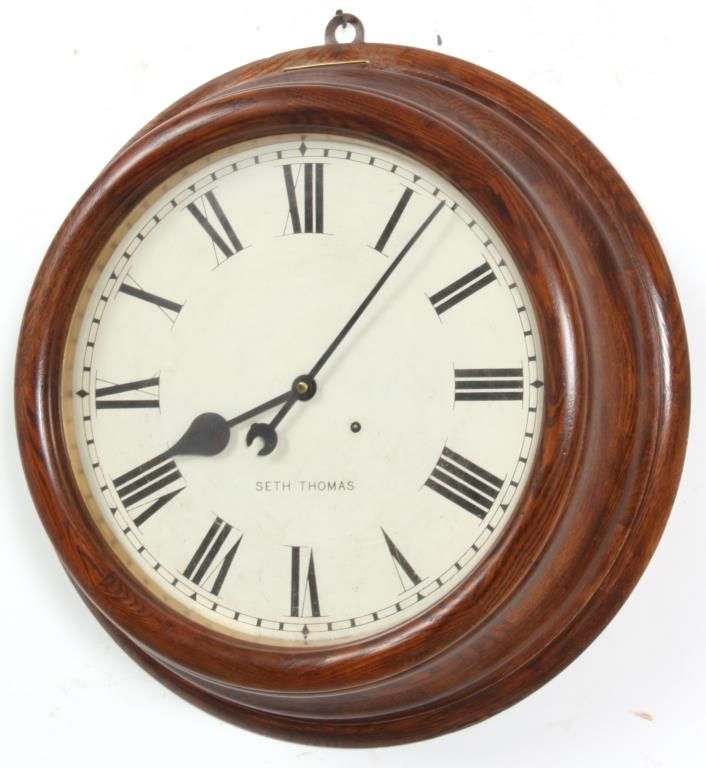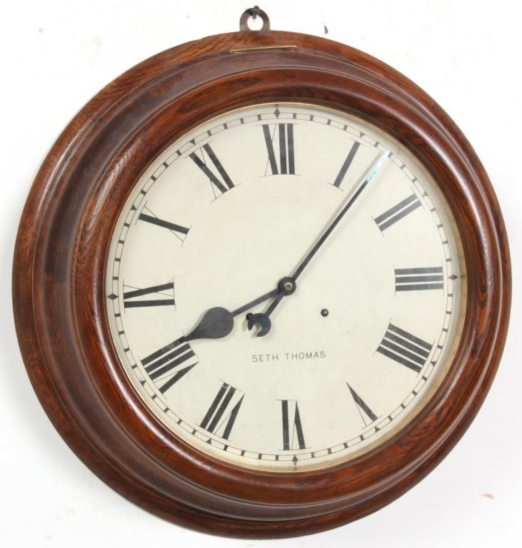 Seth Thomas Oak 18 in. Gallery Clock. Large original 18 in. painted metal dial has black Arabic hour numbers and signed Seth Thomas, large blued spade hour hand and long minute hand with counter weight; 30 day, brass double spring driven time only movement No. 60, has Graham deadbeat escapement, signed with Seth Thomas logo. In a round oak wall hanging gallery case with door bezel hinged at the top and original 18 in. glass, in very good condition, has a good original finish. 25 in. dia.