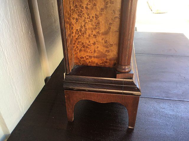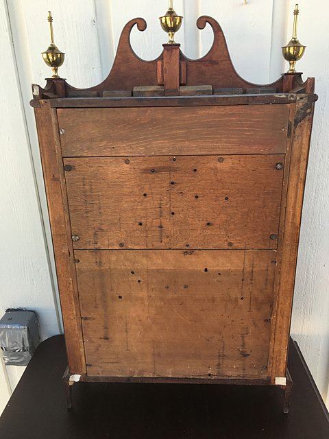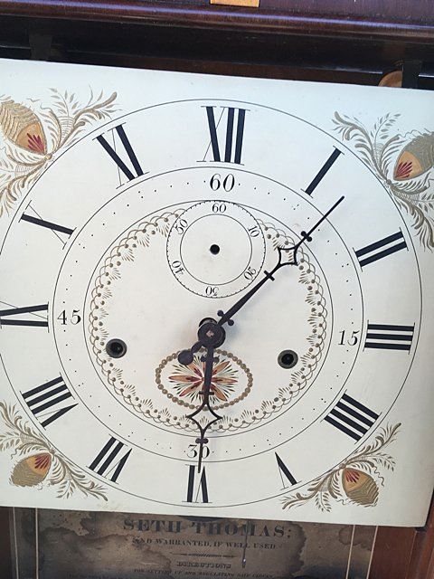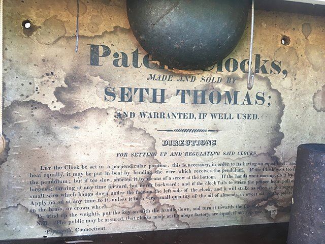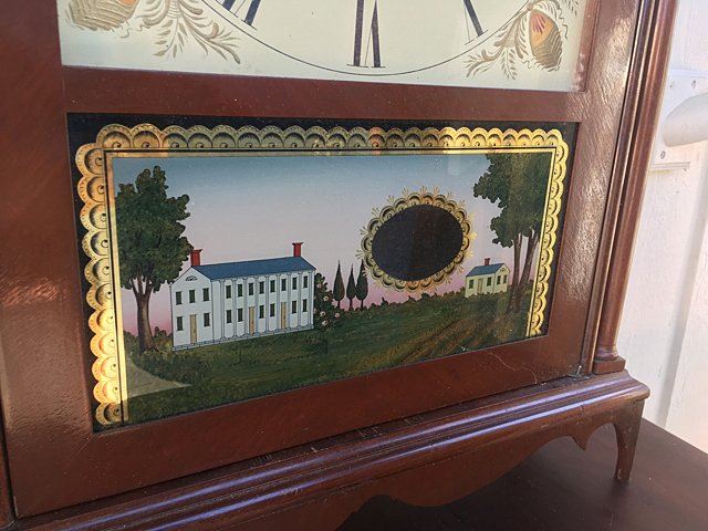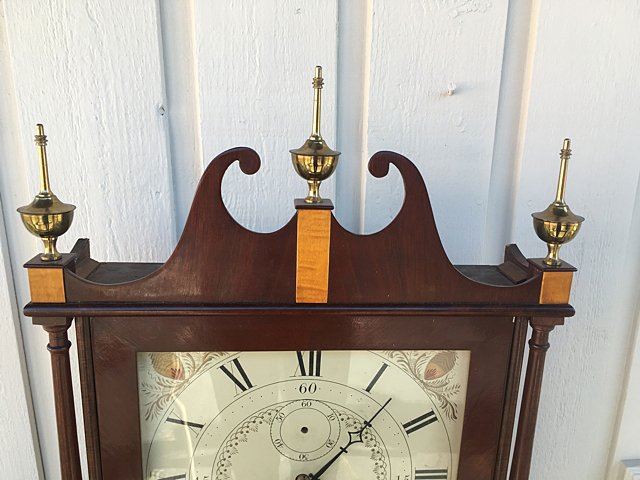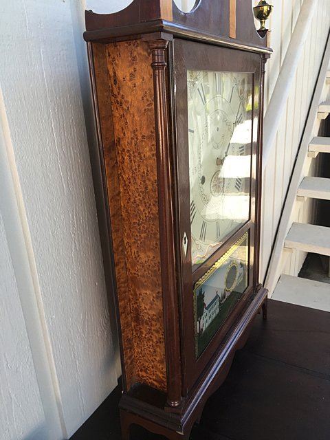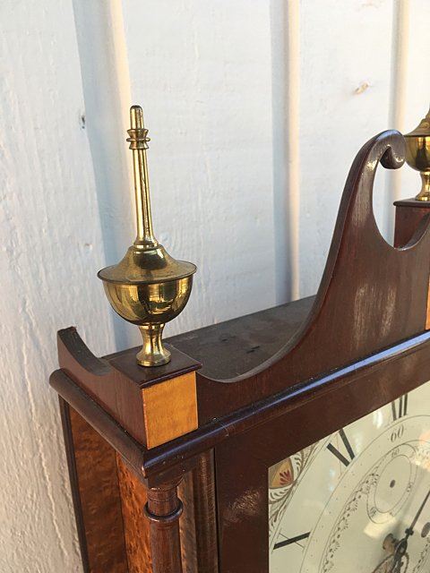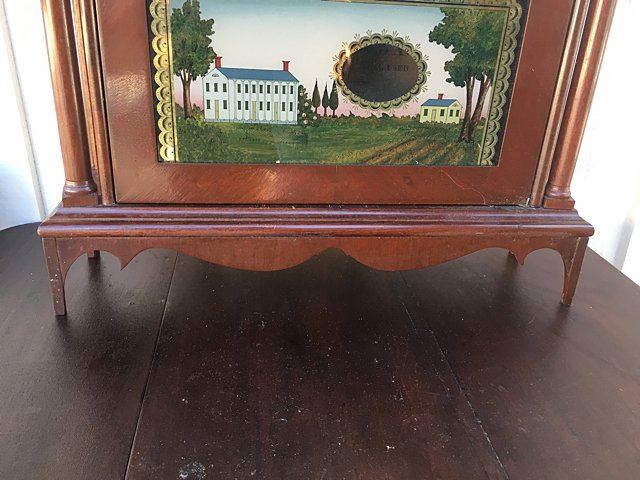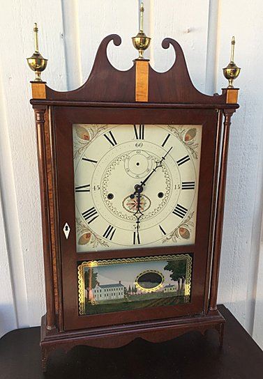 Seth Thomas Off Center Pillar & Scroll with seconds bit, 30 hour, Tiger Maple, wooden works clock. C. 1817 with Moberg reverse repainted glass, 3 brass finials, 2 weights, small key for door. This clock is pictured in Taylor's "The Developmental Era of Eli Terry & Seth Thomas Shelf Clocks pp. 38-39). Measures approx. 16 1/2" wide x 30" tall (to top of finial) x 4 1/4" deep.