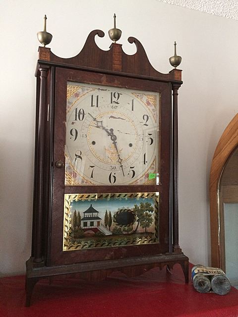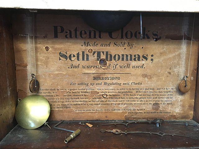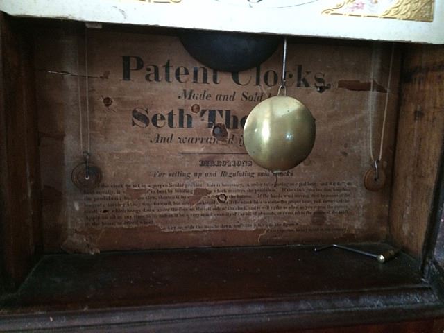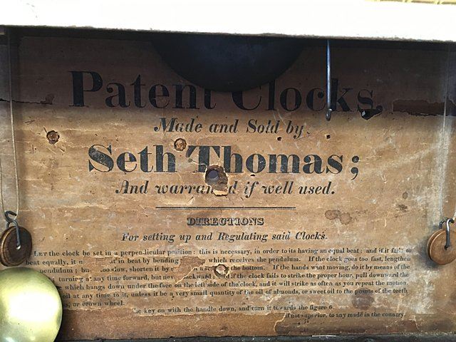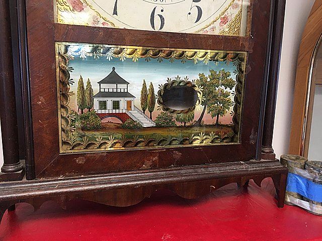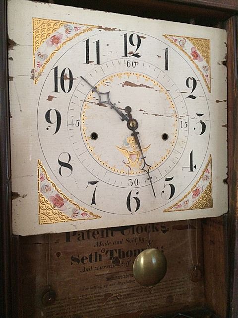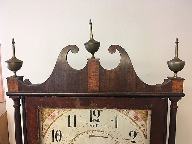 Seth Thomas Off Center Pillar and Scroll clock, Plymouth, Connecticut, c. 1820. Scroll top with three brass urn finials, free standing columns, French footed base, hand painted wooden dial with raised gilt and flowers also with American eagle and shield painted in center of dial, reverse painted glass tablet with off center apeture, very nice label "Patent Clocks, Made and Sold by Seth Thomas", thirty hour wooden works weight driven clock. Has 3 original clock hands, including second hand, pendulum, key and weights. Measures approx. 30" tall x17 1/2" wide by 4 1/2" deep.