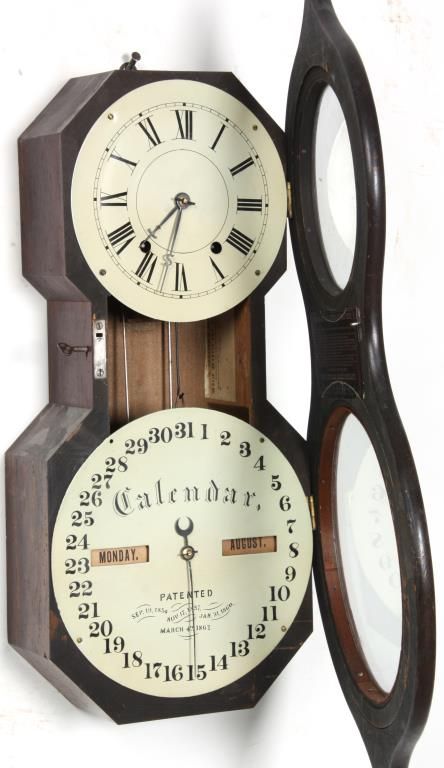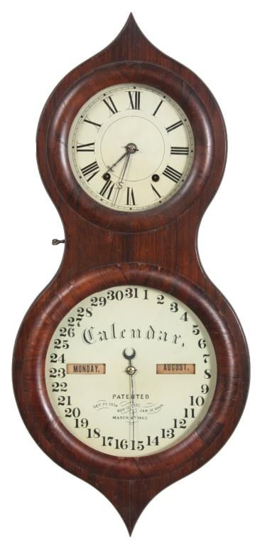 Seth Thomas Rosewood “Peanut” Office Calendar No. 3 Double Dial Wall Clock. 6 in. painted metal dial has black Roman hour numerals and “S” & “T” hands; lower 8 in. calendar dial has Arabic 31 date numbers and open apertures exposing the day and month cylinders. Has an round brass double spring driven time only movement with brass covered bob; lower perpetual calendar mechanism. Replaced dials, calendar hand is repaired, case is in original finish, in good running condition. 24 in. high x 11 in. wide x 4 in. deep.