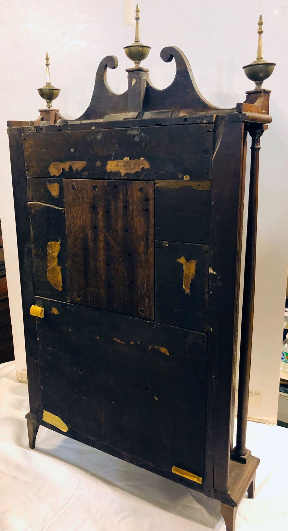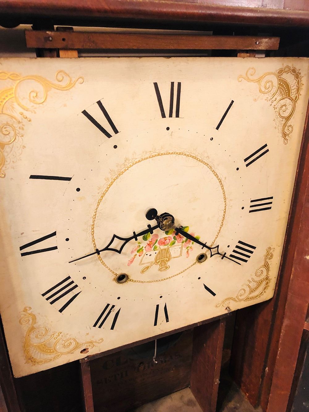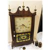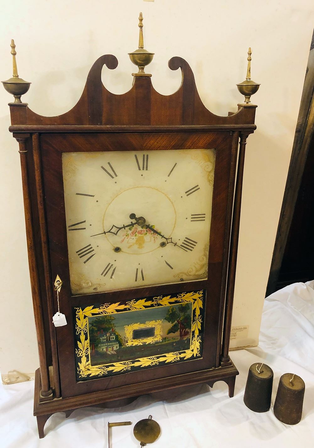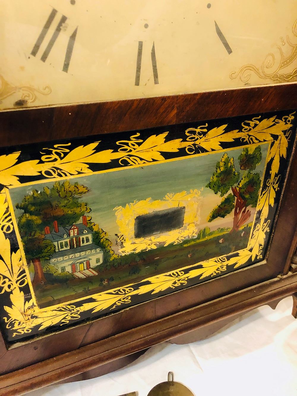 Seth Thomas Pillar and Scroll clock, beautiful clock with reverse painted glass with gold gilt, hand painted dial, pendulum, weights, and key, 3 brass finials, very nice label, Seth Thomas, Plymouth, Conn.