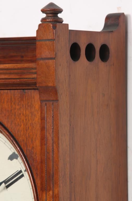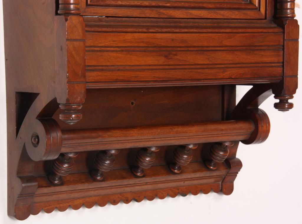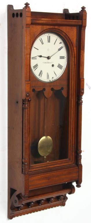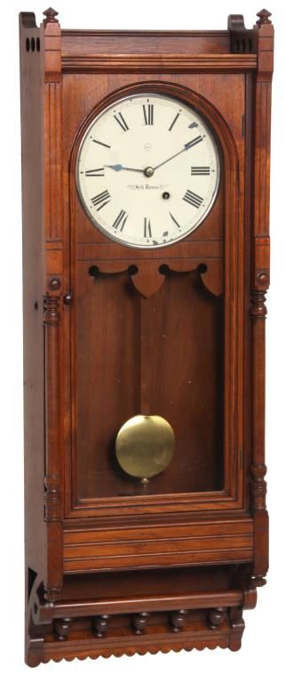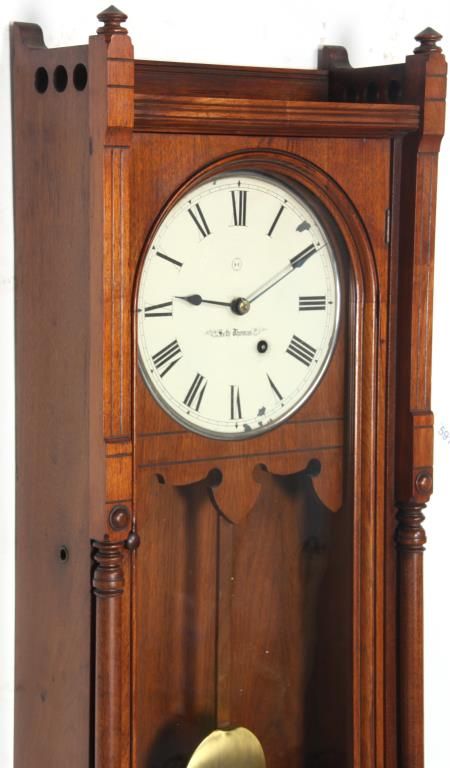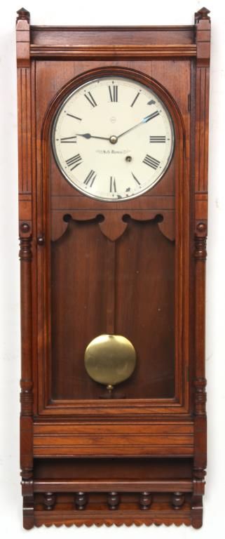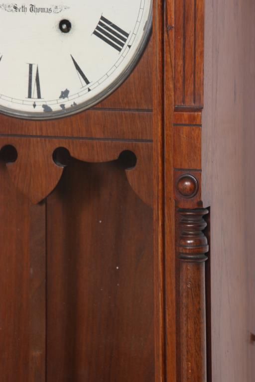 Seth Thomas Queen Anne Wall Clock. 8 in. painted metal dial has black Roman hour numerals and signed Seth Thomas, blued spade hands; 8 day brass time only spring driven movement, recoil escapement, brass covered pendulum bob with wood stick, movement signed Seth Thomas. In a walnut case with turned finials and side columns and carved lower crest with turned spindles, in very good condition and original finish original paper label inside case. 36.5 in. high x 13 in. wide.