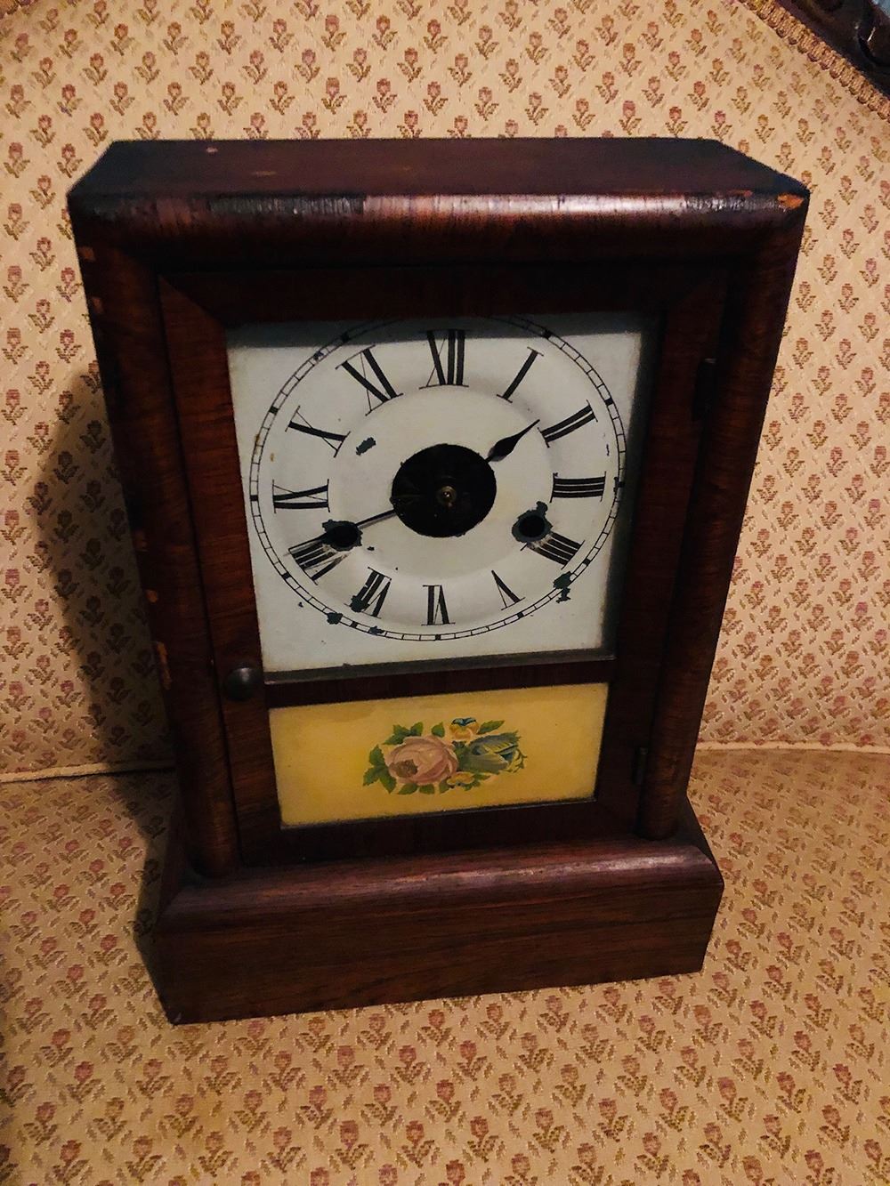 Seth Thomas Rosewood Shelf clock with small rose on lower glass.