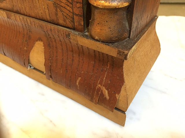 Seth Thomas Shelf Clock, Thomaston, CT. Rosewood case with gold gilt half columns, weight driven (weights included), reverse painted lower tablet. Lower tablet is original with some loss. Some veneer loss at base and front of the door. Nice label "Seth Thomas, Thomaston, Conn.", nice original back.