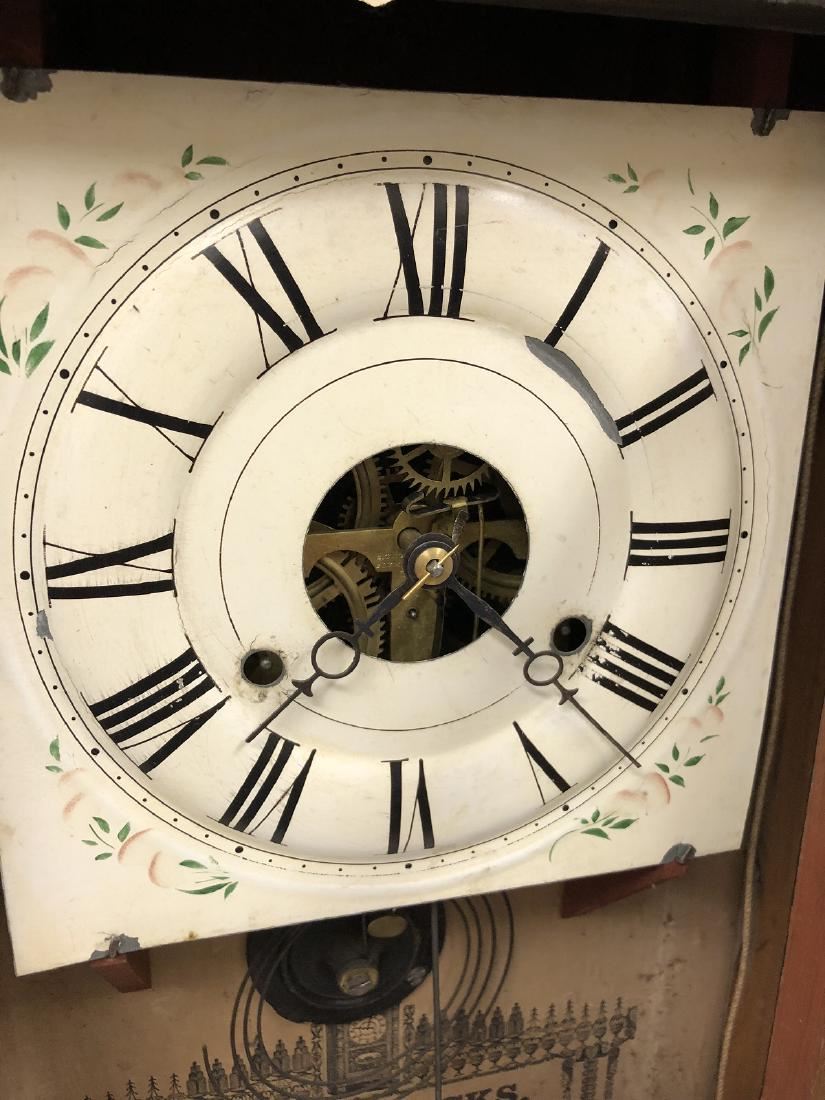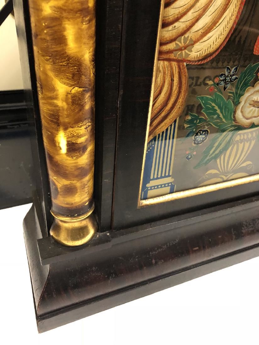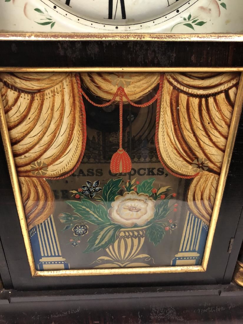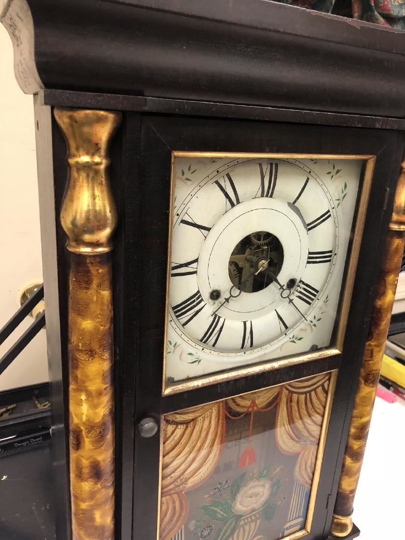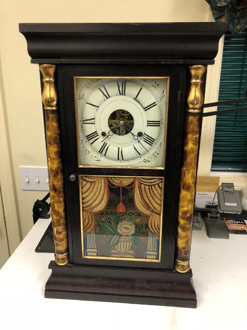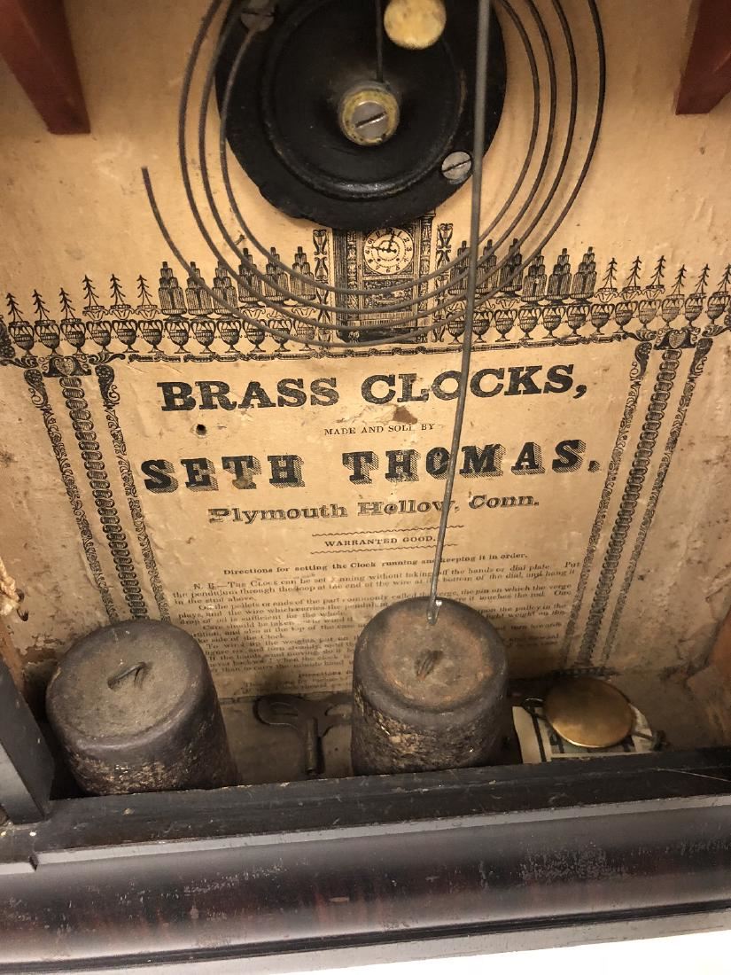Seth Thomas Shelf Clock. Weight driven with unbelievable gold gilt smoke painted columns, wonderful original lower glass, Rosewood with gilting, has unbelievable label. Brass clock, Seth Thomas, Plymouth Hollow, CT, with original weights, keys, pendulum in running condition.