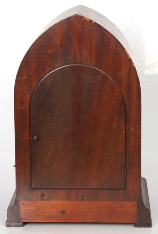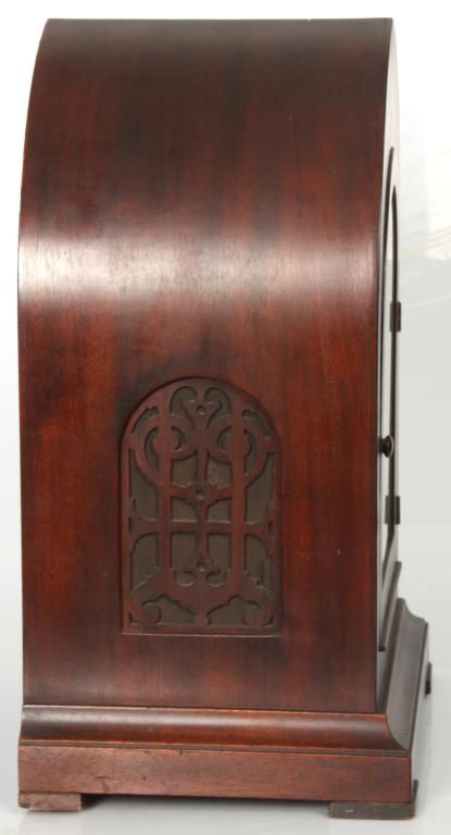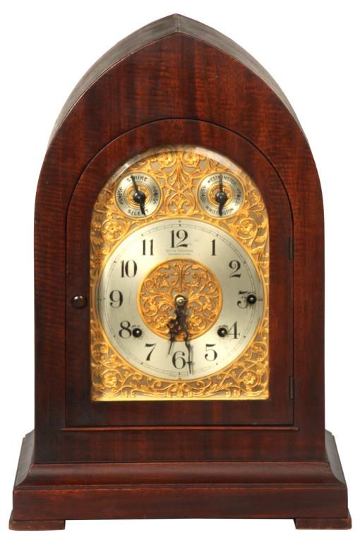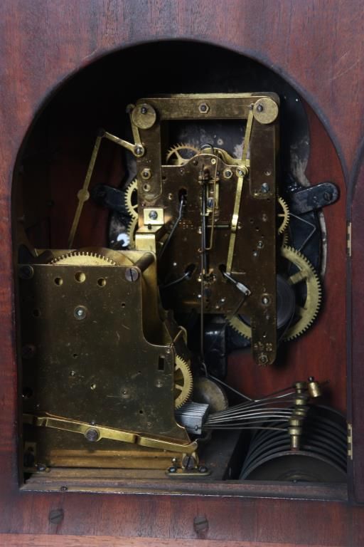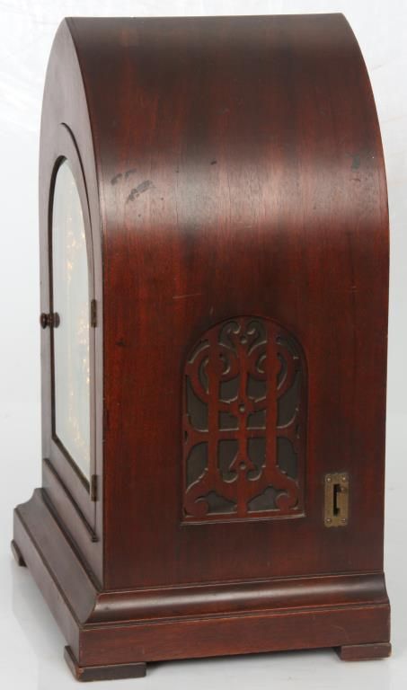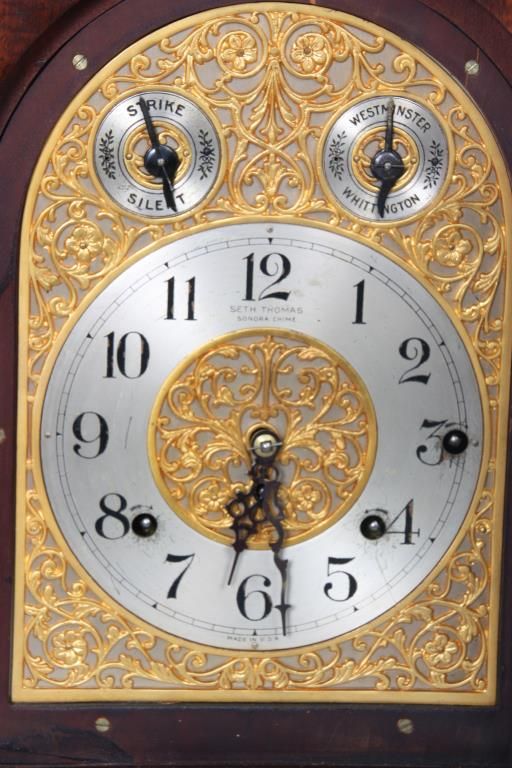 Seth Thomas Sonora Chime Beehive Clock. Mahogany case, silvered 6 in. dial has black hour numbers and fancy pierced black hands, sub dials for Silent/Strike & Westminster/Whittington and pierced gilt brass filigree, dial is signed Seth Thomas – Sonora Chime. Brass triple spring driven movement, has separate mechanism for Sonora 8 bell chime and eighth bell striking the hour on a second hammer. In original finish, time mechanism and strike mechanisms are not running. 18 in. high x 12.25 in. wide x 9.5 in. deep.