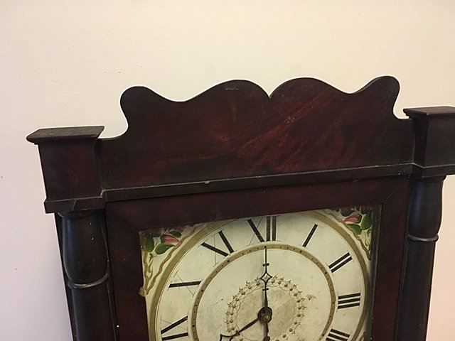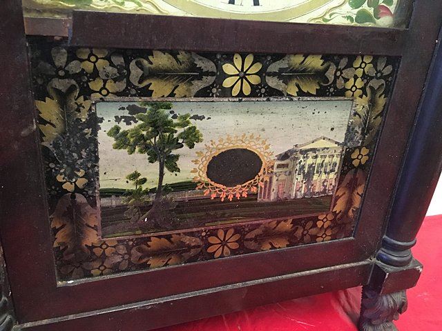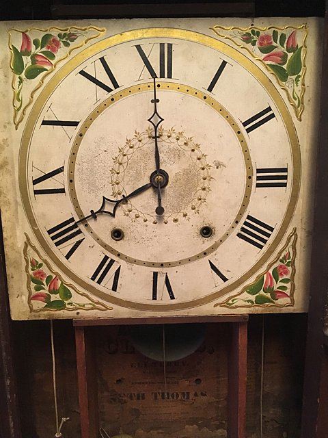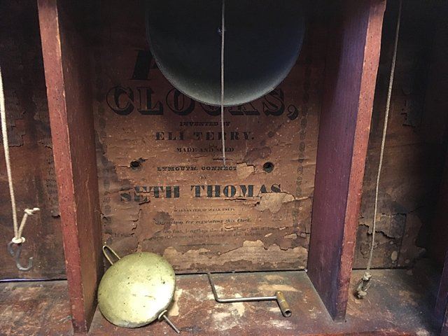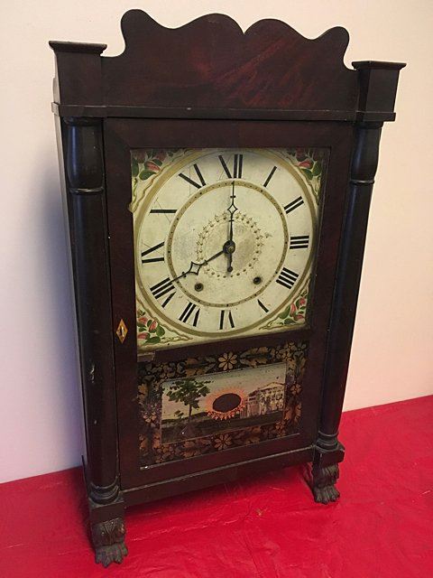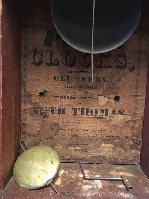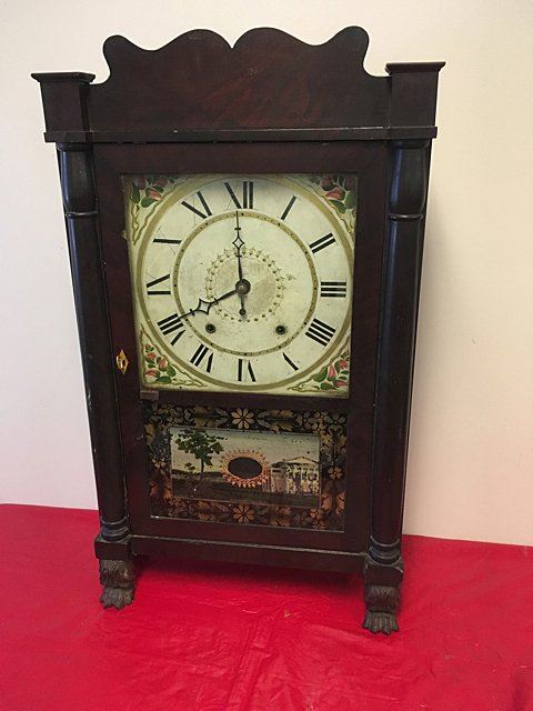 Seth Thomas Mahogany Transitional Shelf Clock, Plymouth, Connecticut, ca. 1830s, splat and half columns flank door, stenciled and reverse painted lower table, painted dial with flower corner decorations, label, "Invented by Eli Terry, Made and Sold at Plymouth, Connecticut, by Seth Thomas". Wooden works, thirty hour time and strike movement. Measures approx. 29 1/2" tall x 17" wide x 5" deep.