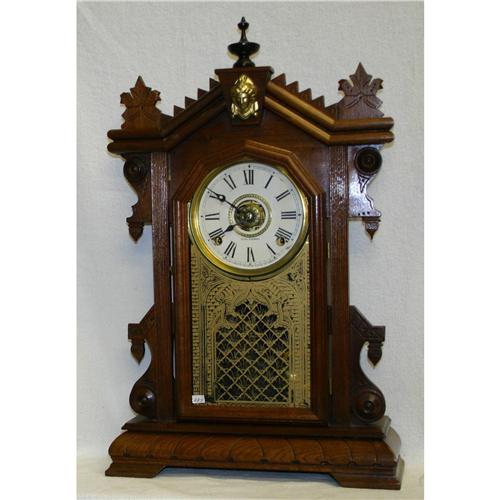 Seth Thomas Walnut Kitchen Clock - Painted dial with Roman Numerals is marked Seth Thomas.  Glass door with gilt decorations.  Decorative brass pendulum.  Measures approximately 14 ½" x 23 ½" T.