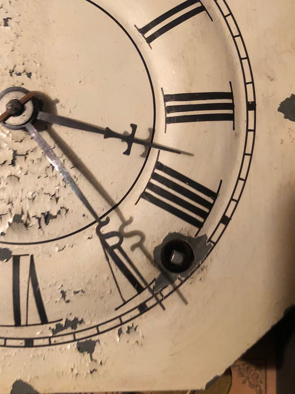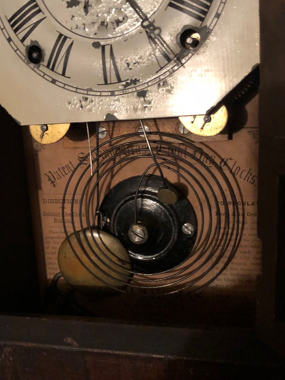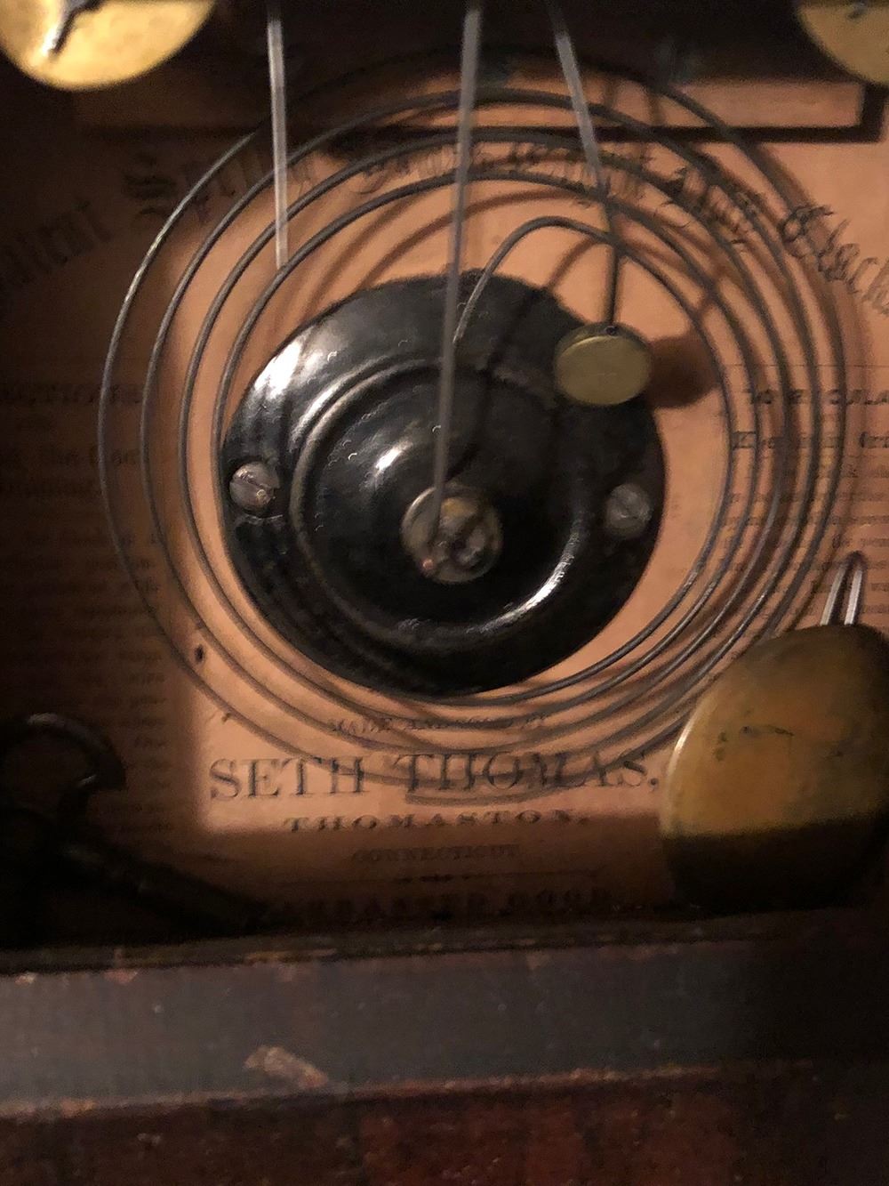 Seth Thomas Rosewood shelf clock. Gold on lower glass, S and T initials on dial hands.